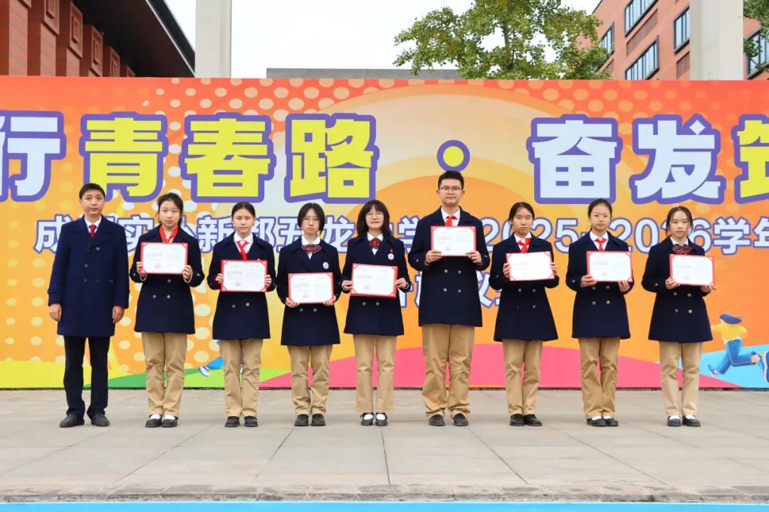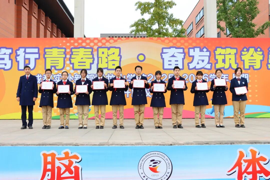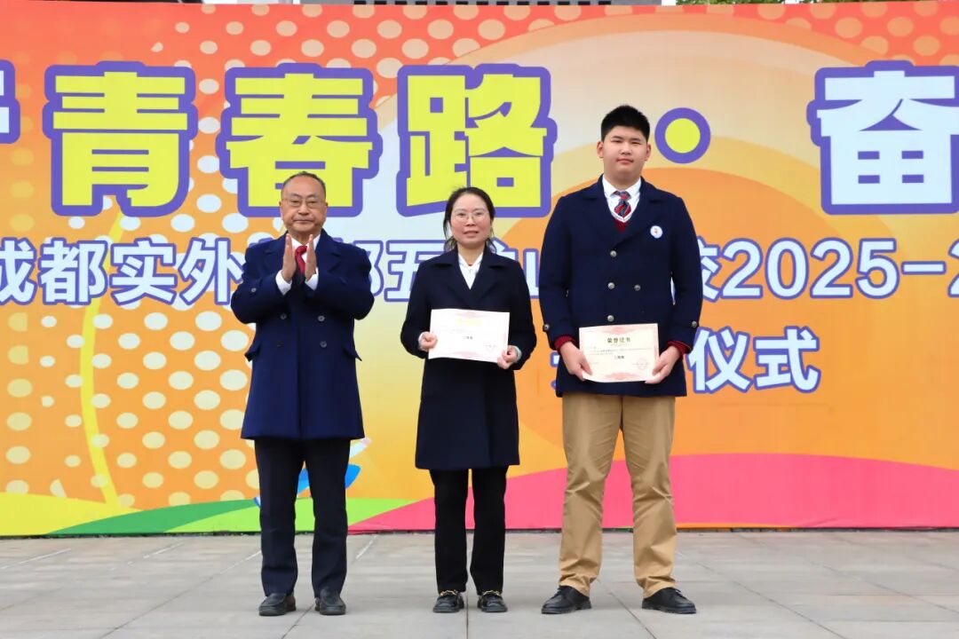 在2025年成都市新都区线上科学学生实验微视频征集活动中,我校由钟祥环老师精心指导,林祺凯同学创作的作品《大象牙膏实验》荣获二等奖。李俊校长为他们颁发奖状,并表示祝贺。