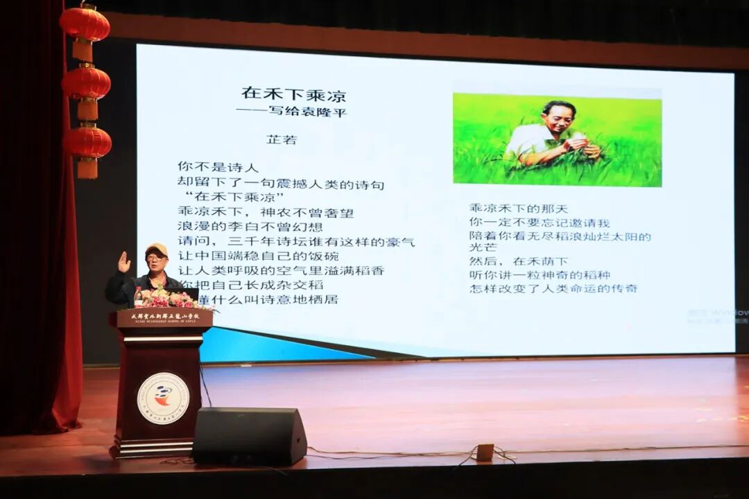 最后,干教授在讲座中分享了自己的创作经历,他引用了一首源于自己日常生活感悟的诗歌,以此为例,展示了如何从平凡的事物中提炼出深刻的诗意。他解释道,无论是清晨的第一缕阳光,还是夜晚归家时街角的灯火,生活中的每一个瞬间都可能成为激发创作灵感的源泉。随后,干教授展示了不同年龄段学生的作品,从中可以看到,小学生的作品往往充满了童趣与纯真,他们用简单的词汇描绘出多彩的世界;中学生的作品则开始展现更深层次的情感与思考,他们在探索自我与外界关系的同时,尝试运用更为复杂的修辞手法;而高中生的作品则更加成熟,不仅体现了对社会现象的敏锐观察,还蕴含着对未来人生路途的哲思。通过这些例子,干教授强调了现代诗歌创作的关键在于敏锐的观察力、真诚的情感表达以及富有创意的语言运用。