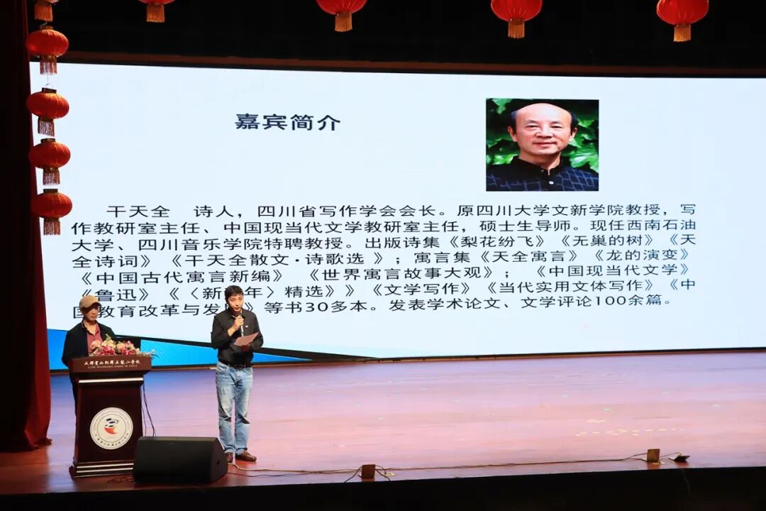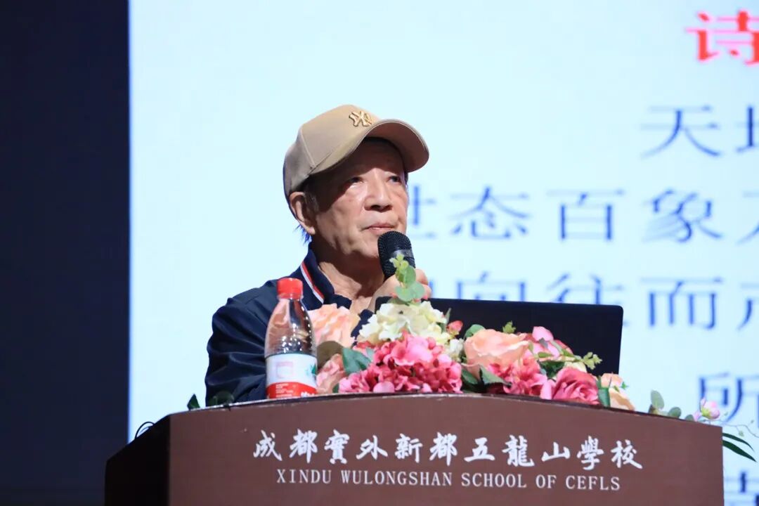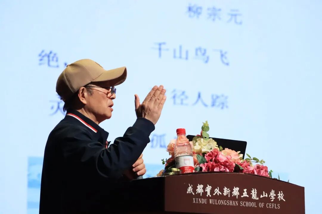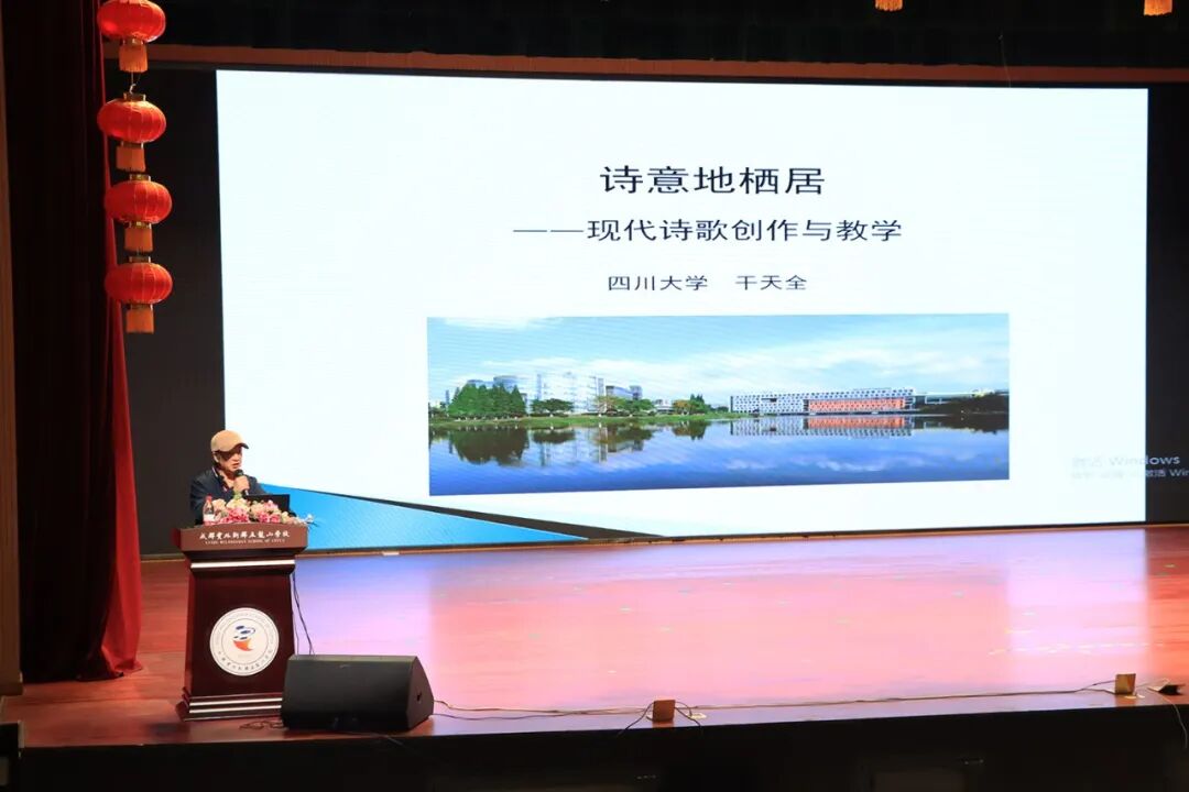 在文学艺术的浩瀚星空中,新诗以其独特的语言魅力、深邃的思想内涵和灵活多变的形式,成为了现当代文学不可或缺的组成部分。成都实外新都五龙山学校为了进一步提升我校师生对新诗创作与教学的理解与兴趣,促进文学交流与学术创新,2024年10月17日下午特邀请四川大学知名教授干天全先生莅临我校,举办了一场题为“现代诗歌写作与教学”的专题讲座。本次活动旨在通过权威专家的深度剖析与实战分享,激发师生的创作灵感,提升新诗教学与创作能力,推动校园文学氛围的繁荣发展。李俊校长、全校语文老师及初高中部分班级学生参加了讲座。