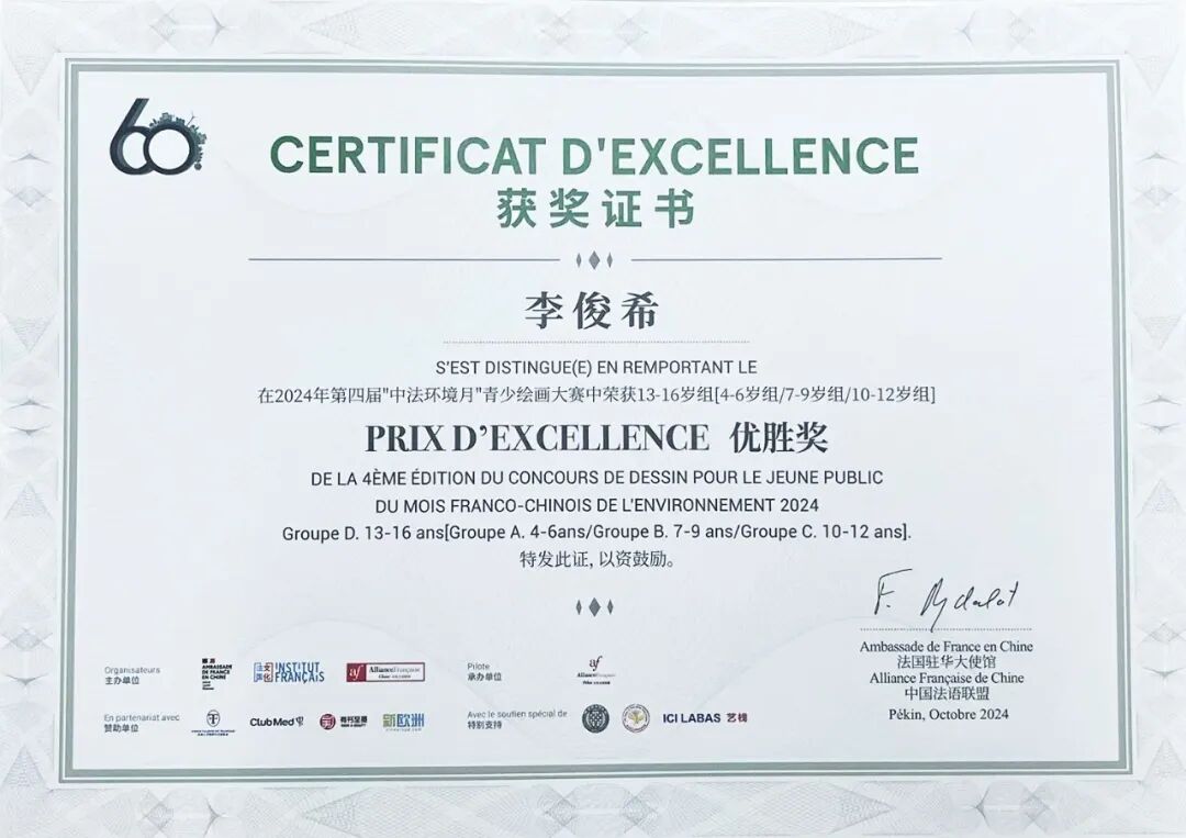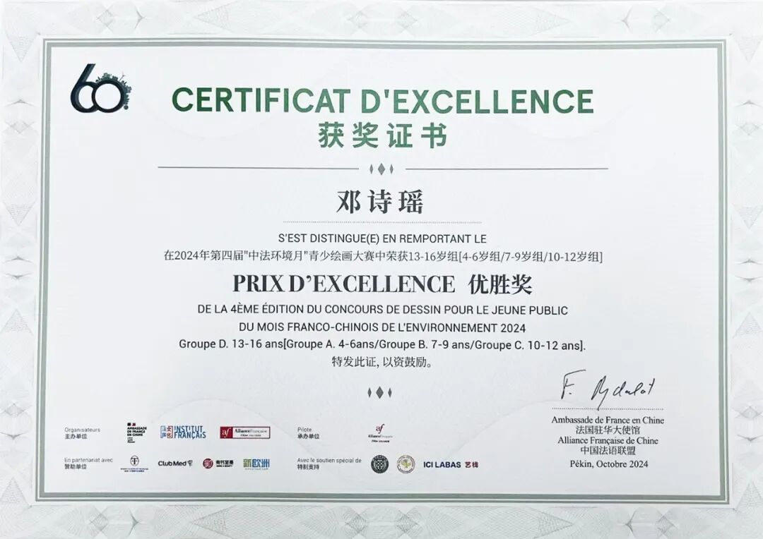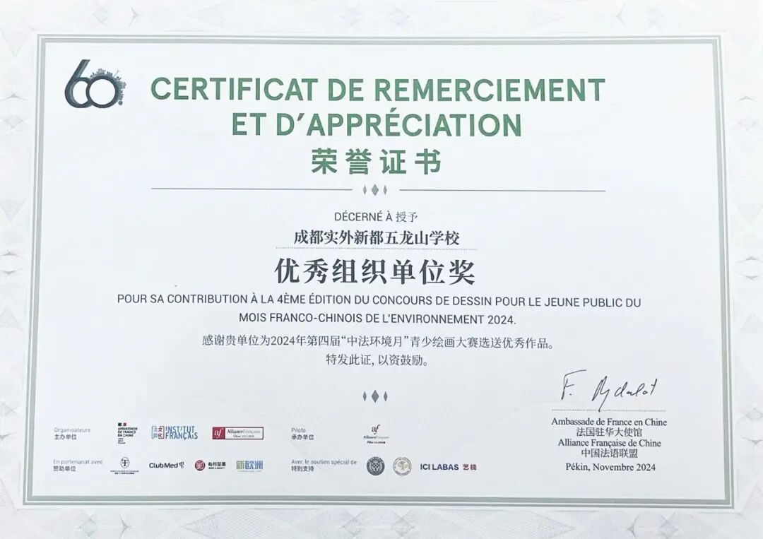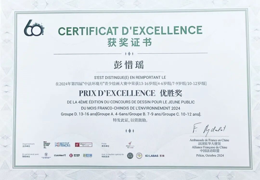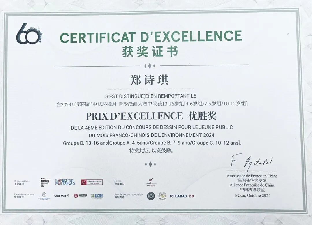 在此次绘画大赛中,我校也连续第三年被组委会评为“优秀组织单位奖”,展示出对我校的教育理念和学生创造力的认可。我校同学们的获奖作品将有机会在北京和法国巴黎展出,这是中法建交60周年之际,我校与国际舞台的一次近距离对话。