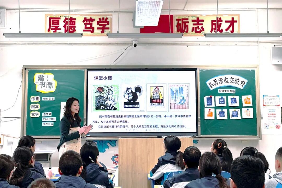 郭玲伊老师在初二6班讲授的《方寸之间,镌刻印记——藏书票》美育课程,将艺术实践与文化传承完美融合。通过展示国内外经典藏书票作品,让学生在视觉对话中理解文化差异;在实践环节,耐心指导学生掌握版画刻制技法,鼓励学生将松潘中学的建筑、校园景观等元素融入设计。“书香票友交流会”上,学生们互相展示作品、分享创作思路,在方寸之间体悟文化传承的意义,树立起爱书惜书的文化自觉。
