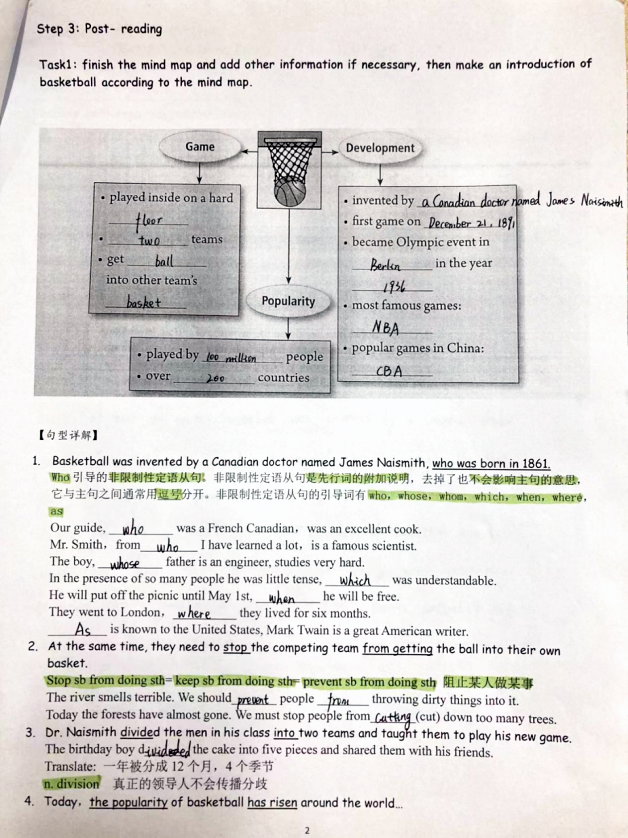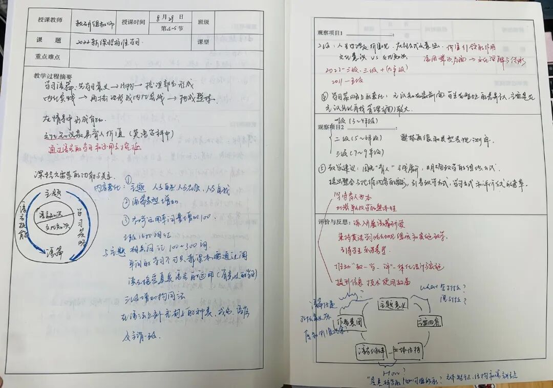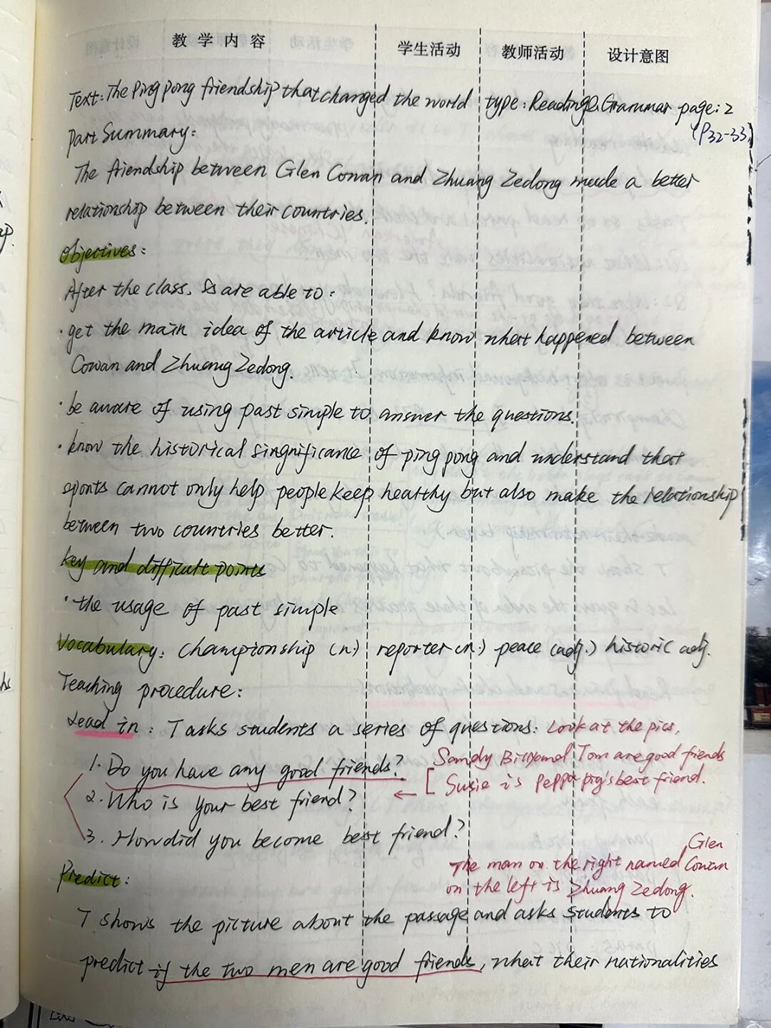 初中英语组老师们教案的特色是色彩丰富,不同的颜色表示不同的重点,使得教学设计也能像一副画一样让人赏心悦目。此外,他们娟秀、工整、行云流水的书写也使得教案“颜值爆表”。