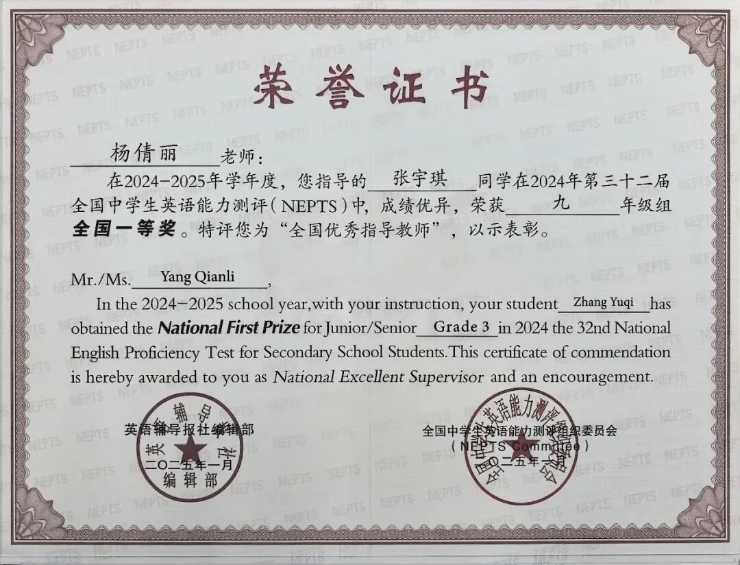 在过去一学年中,英语组在英语教学与教研领域取得骄人成绩,共荣获国家级奖项3项、省级以上荣誉5项。英语组积极探索AI与教学的深度融合;在DCWE写作教学等领域形成鲜明主张,多篇论文在市级评选中获奖;课堂教学屡获区级、集团级一等奖,并多次承担示范展示。指导学生在全国性英语能力测评及风采展示活动中频频斩获高级别奖项,多次获评“全国优秀指导教师”,充分展现了英语组卓越的教学创新力、科研实践力与育人影响力。