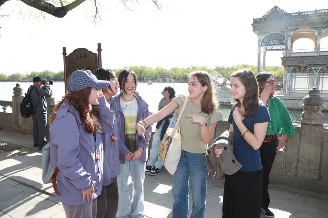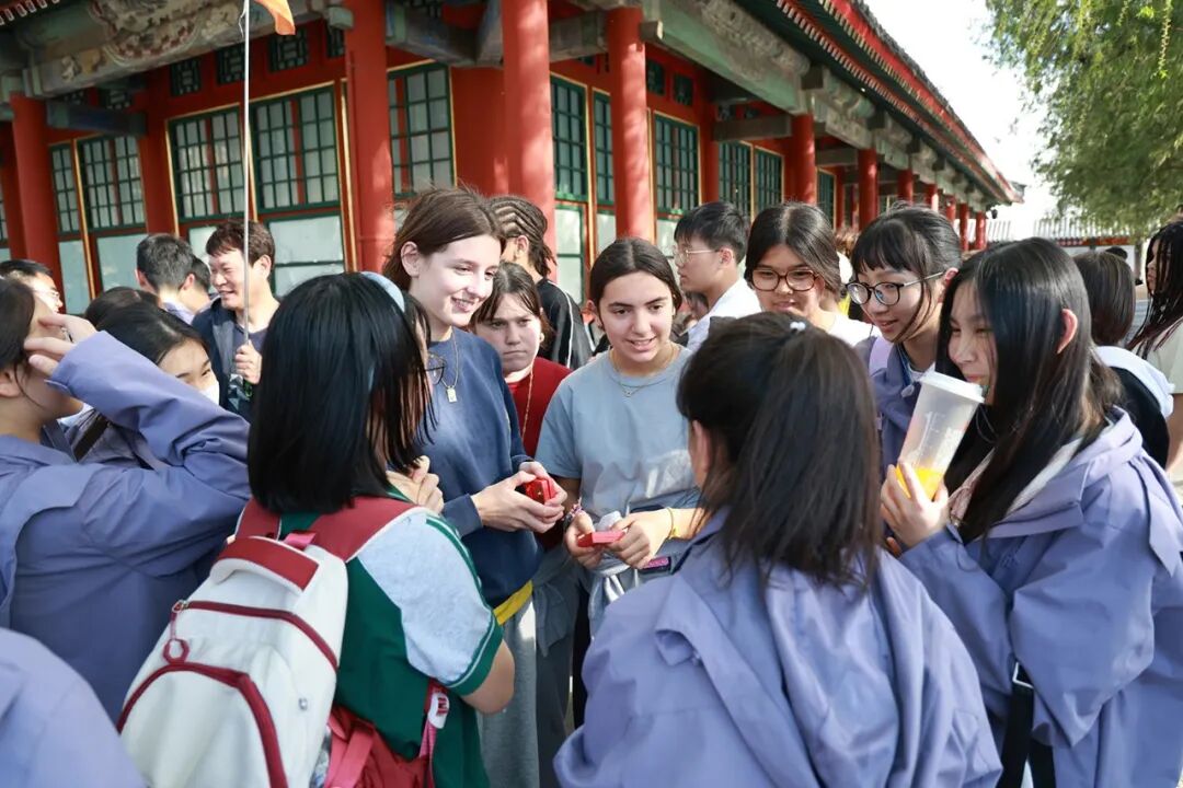 同学们在研学过程中与外国学生流利交流