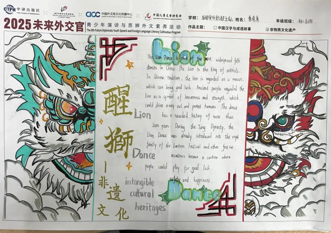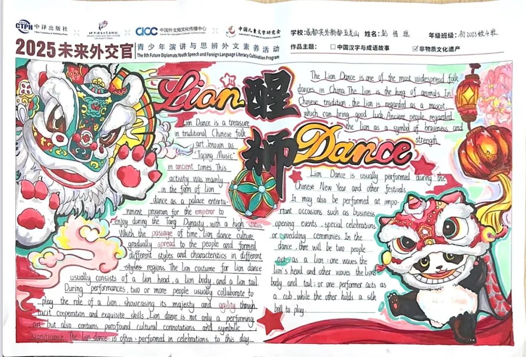 本次活动中,学生们以手抄报的形式,用英语讲述中国故事,传播中国文化。他们用英语和绘画,将抽象的中国传统文化概念具象化,让参观者在欣赏美的同时,也能感受到中国文化的魅力和深厚底蕴。用英语讲好中国故事,传播中国文化,增强了文化自信和民族自豪感。