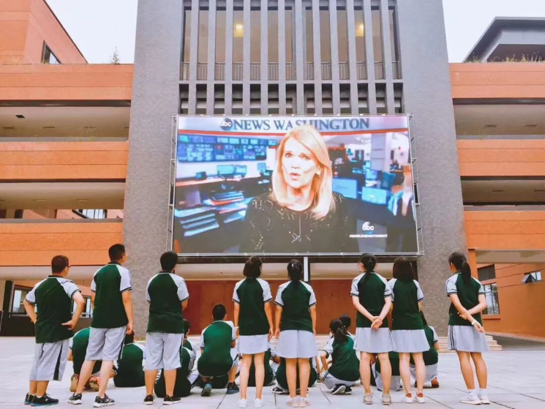 晚饭后学校播放国际新闻速览,学生自主在大屏幕前观看学习