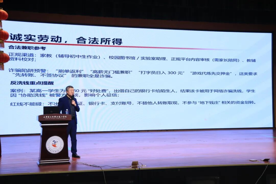 马克老师强调,投资智慧的核心是认清风险而非盲目逐利。他以通俗类比讲解基础理财知识,明确学生阶段“以学为主、不涉高风险投资”的原则。他总结防投资诈骗口诀,提醒大家警惕内幕消息、拉人头返利等骗局,远离虚拟货币买卖、地下钱庄转账等违法违规行为。