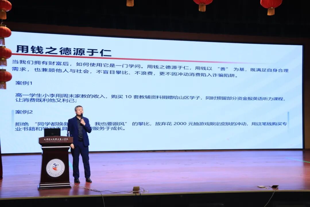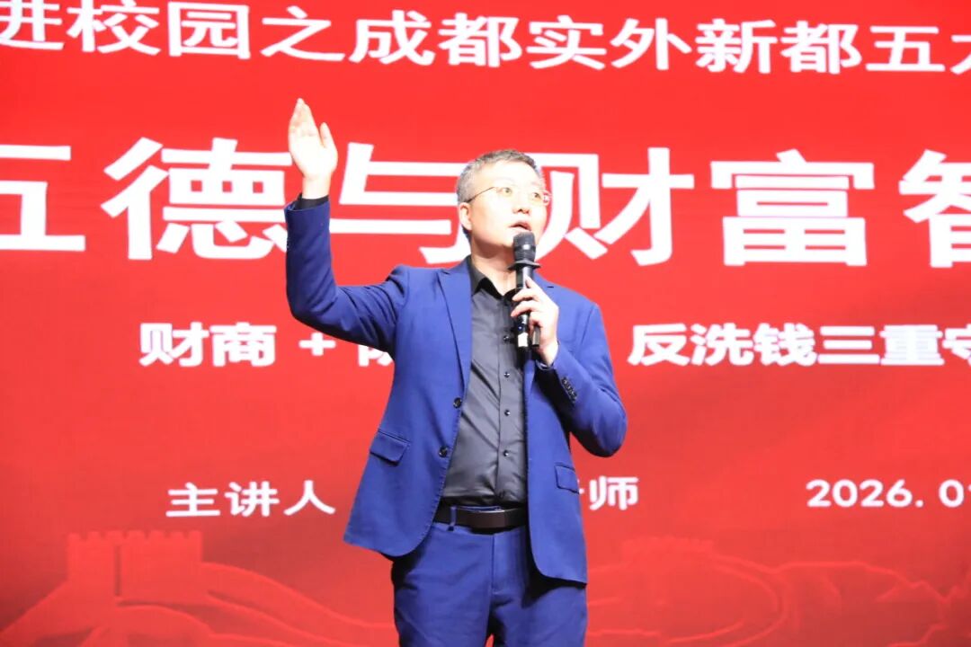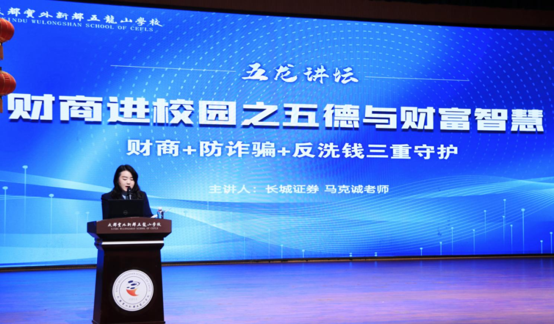 期末考试结束,校园里满是卸下课业压力的轻松氛围。为让学子在身心舒展的同时收获新知,我校 “五龙讲坛” 特邀长城证券成都天晖中街营业部资深投资顾问马克诚老师、合规经理张翰之女士,带来 “五德与财富智慧” 主题讲座。学工部主任兰芳芳老师主持活动,初二年级与高一年级学子齐聚现场,在传统文化与金融知识的交融中,开启一场兼具趣味与深度的财富成长之旅,既纾解了备考疲惫,更筑牢了金融安全防线、树立了正确财富观。
