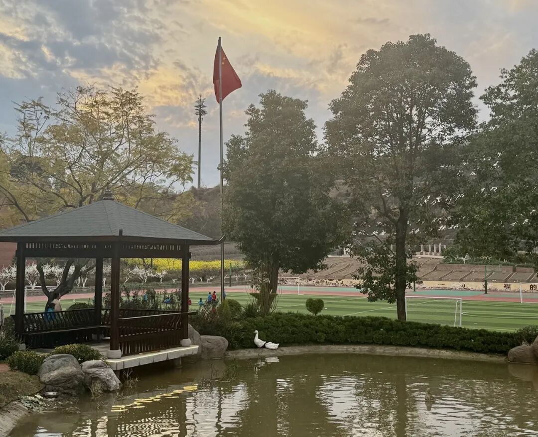 同时学校不断加强校园文化建设。校园是同学们生活和学习的环境,是学生文化熏陶的场所,所以文化性是校园“立德树人”的原点。学校历经数年深耕,已为校园建筑与道路注入文化内涵。如今在成实外教育集团、热心家长的支持及学校资金投入下,学校借鉴苏州园林理念改造龙眼池,打造出兼具瘦西湖意境的高雅景观,为校园文化建设再添新彩。