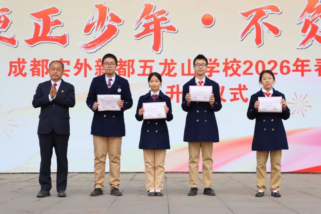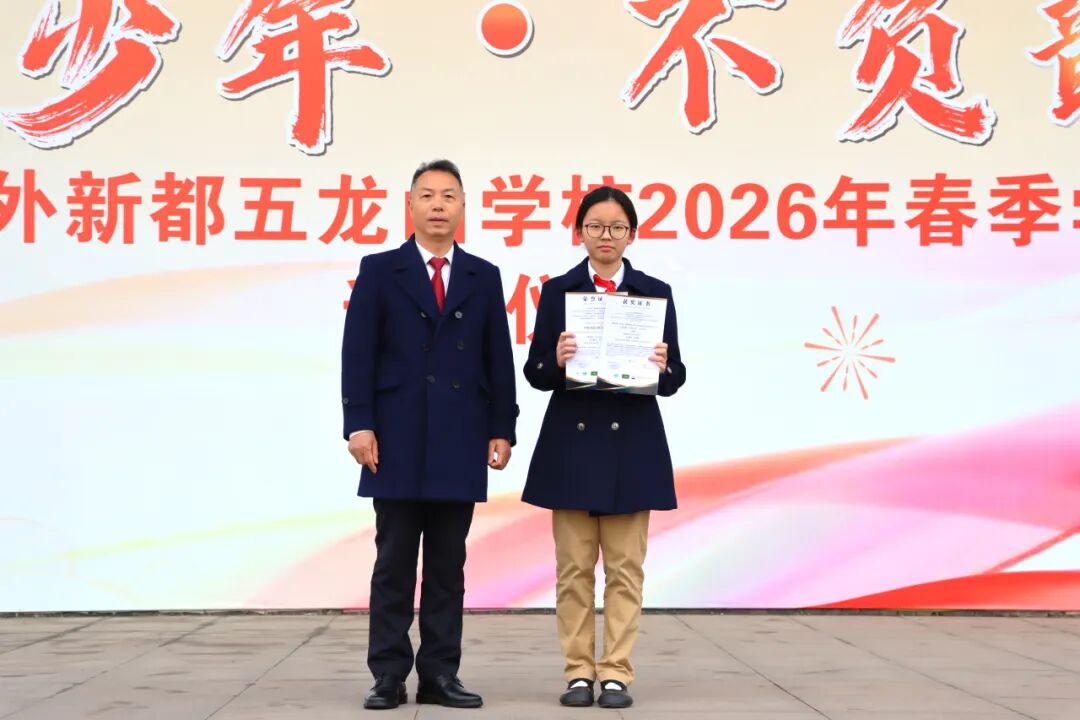 本次升旗仪式还举行了颁奖典礼。在“第三届‘中国年’——‘中国印记·马年非遗对话法兰西’”系列庆祝活动中,我校初2025级4班的李佳钿同学,凭借作品“太极”荣获优胜奖,并被评选为“中法友谊文化小使者”。张盛副校长为她颁奖并表示祝贺。