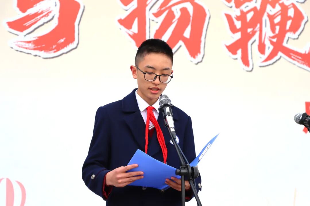 在本次仪式上,初二4班郭益骏同学为大家带来了题为“播种一片新绿,营造满园芬芳”的国旗下献词。