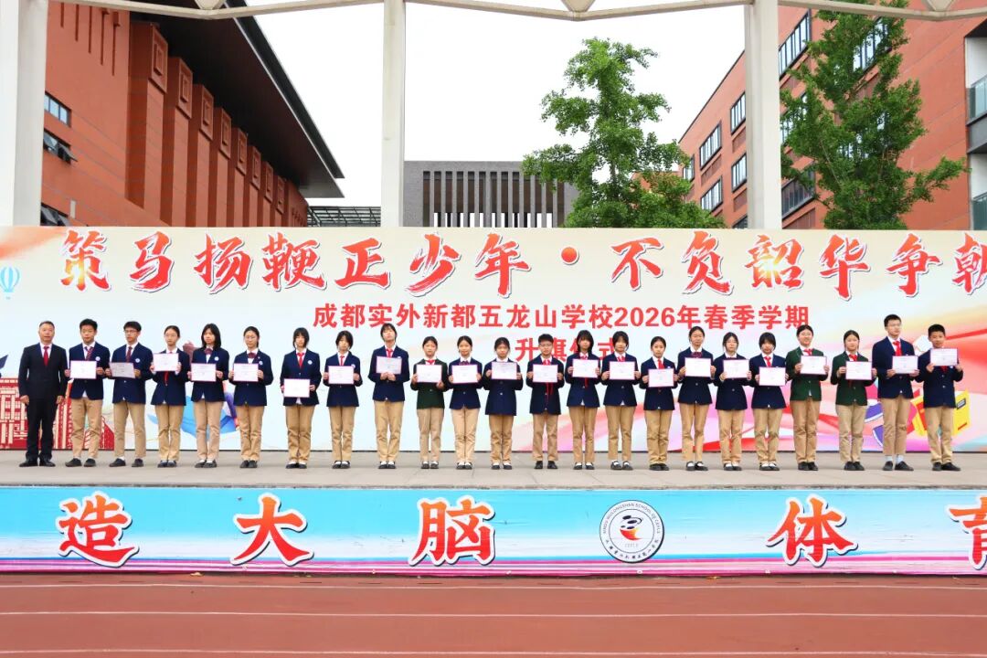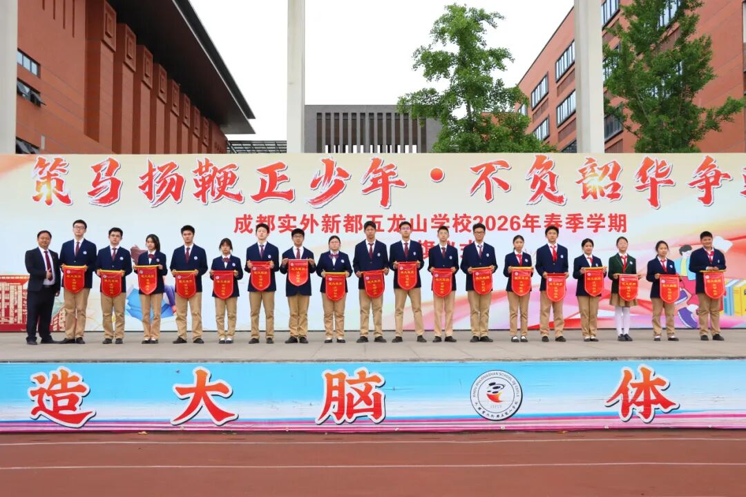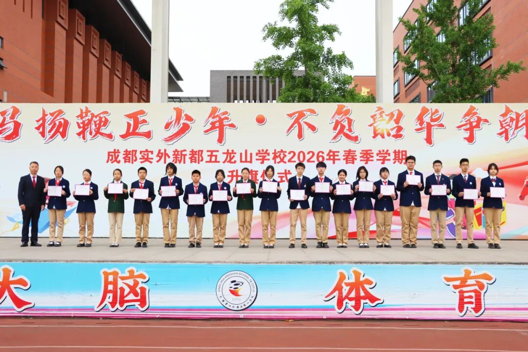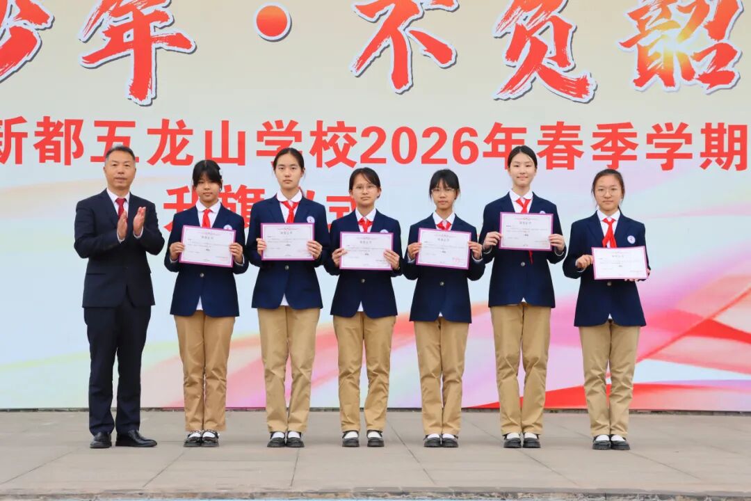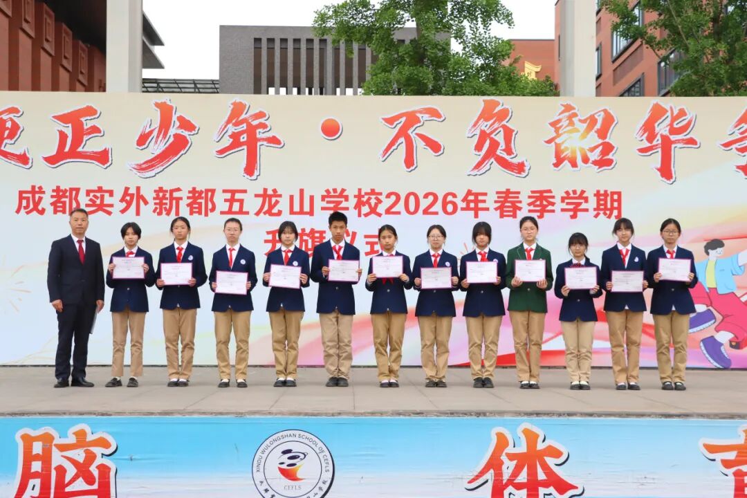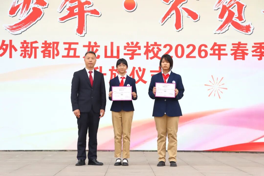 本次升旗仪式还举行了“给烈士写一封信”主题征文活动颁奖典礼。在红军长征胜利90周年之际,同学们以笔墨致敬英烈,经班级初评与校级评审,最终评选出特等奖3名、一等奖6名、二等奖14名、三等奖18名及优秀奖24名。其中,蔡学阳同学的作品从9106封投稿中脱颖而出,入选成都市100封优秀信件名单,在主流媒体平台展播,并于清明节期间在成都市烈士陵园等地展出、收藏。张盛副校长为获奖同学颁奖并表示祝贺!