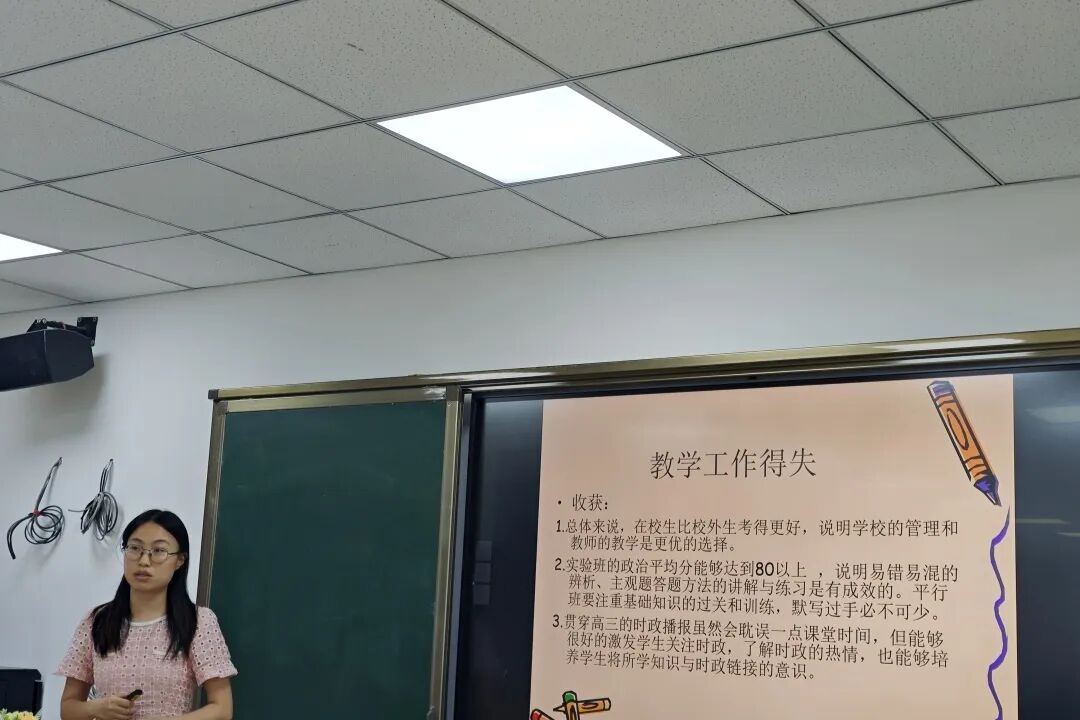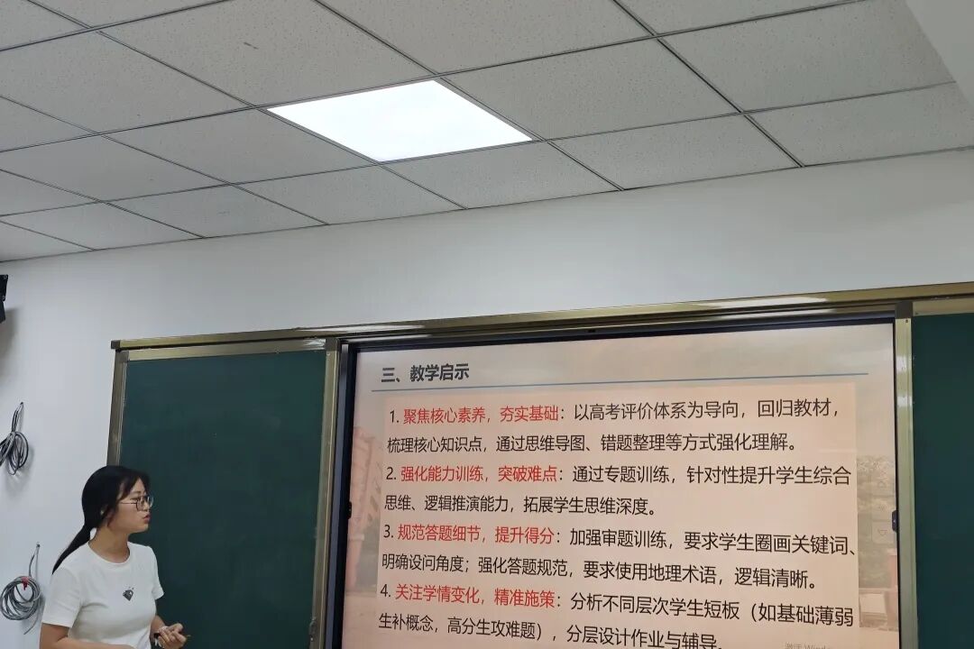 政治李小琴老师细致地梳理了高三不同时段资料的编写与选择,强调了时政播报对学生学习热情激发与有效备考的促进作用,分享了组内系统的专题式教研对于吃透教材、指引备考的意义。历史王少辉老师强调教师要“相信相信的力量”,聚焦教学相长、师生共进;坚持教学评一体化,把握好课标、教材、考情与学情的多维互动;用活课内概念与真题概念;分类整合真题资源,延展必备知识;明确价值导向,创设问题情境,提升课堂教学效益。地理刘婷老师认为高三教学要聚焦必备知识、关键能力、学科素养与核心价值;要依托思维导图、错题整理强化必备知识的理解与迁移;通过专题训练,提升学生的综合思维与逻辑推演能力;规范答题细节,针对学情精准施策,最终提升学业成就。