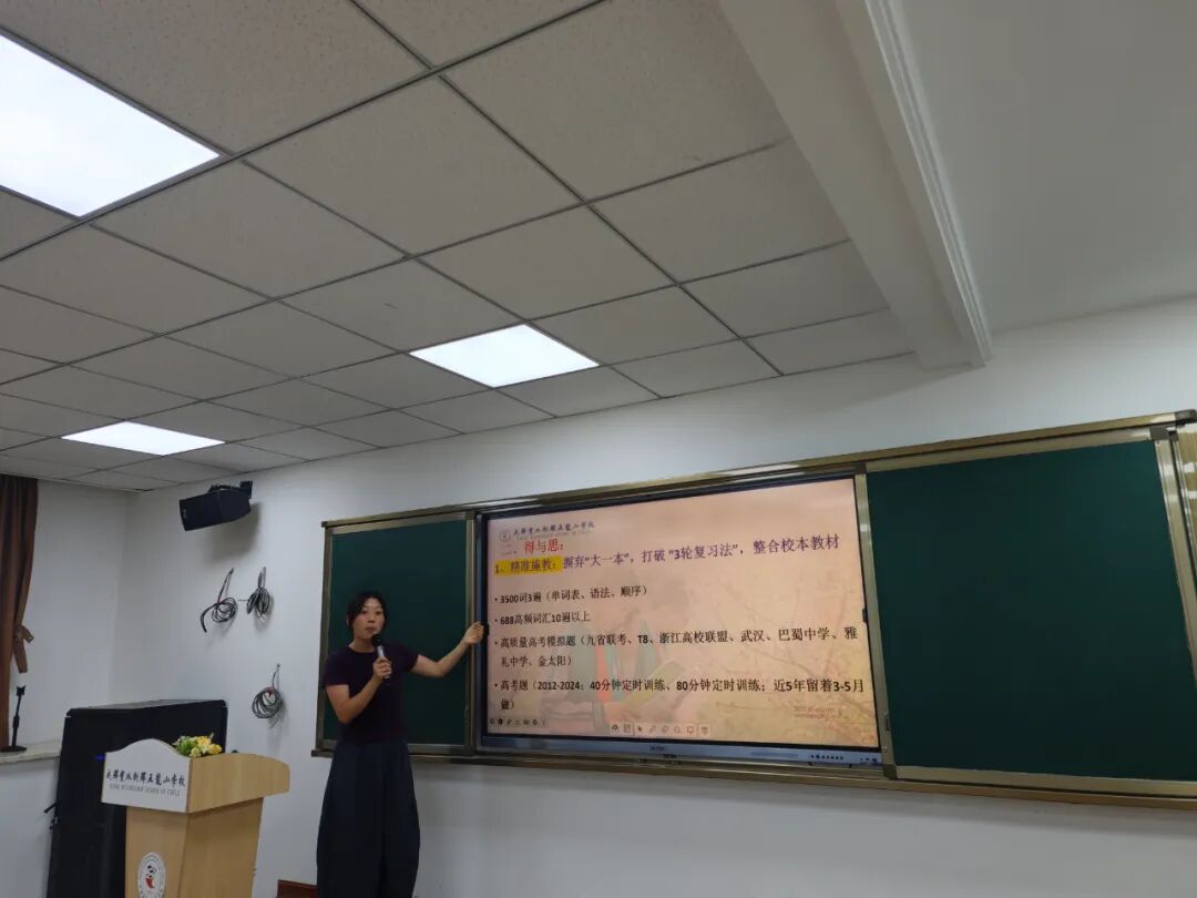 语文张彩霞老师强调“每个同学都有学好语文的潜力”,要引导学生“博观而约取,厚积而薄发”,善用AI作文批改系统,针对性提升写作质量。数学杨松老师认为要强化分层教学与分层复习,让不同学生分别拥有“低起点的获得感”与“高落差的成就感”,一方面不断夯实基础,修正学生答题步骤的规范性,一方面持续训练思维,对标新高考“多想少算”的考查方向。英语唐永秋老师强调了学情分析的精准性与校本资料的针对性,“要用五龙山的材料来教五龙山的娃”,分享了英语组不断探索固化的分层教学方法,走“学生路线”,组建“评讲学生小分队”、“作文批改反馈小分队”等学生团队,促进生生互评。