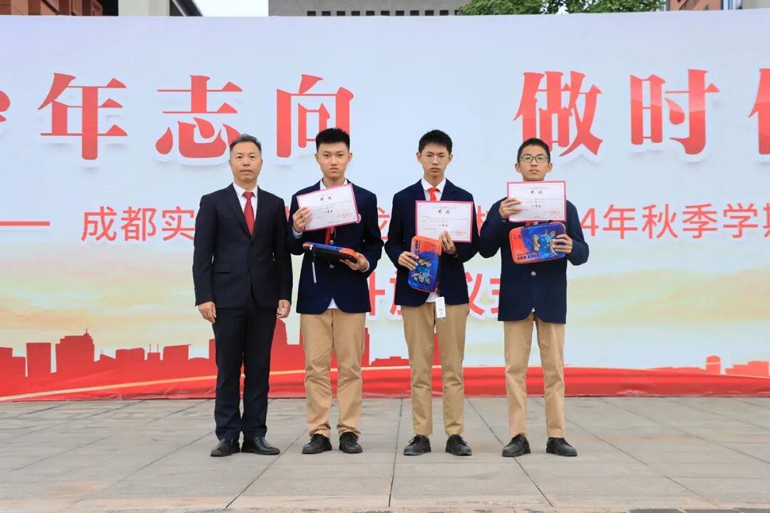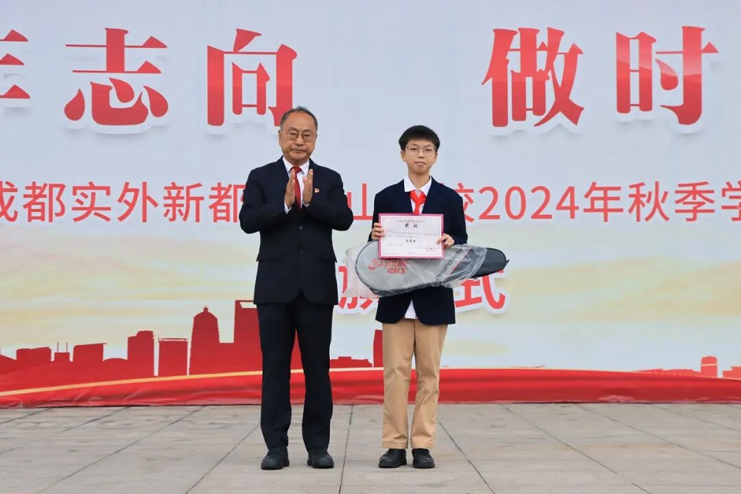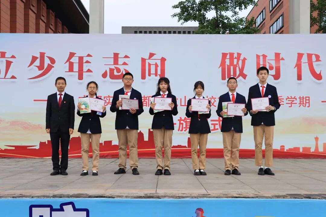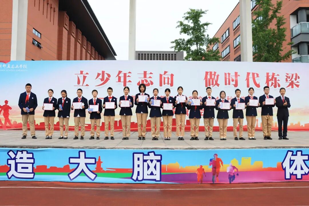 本次升旗仪式上还进行了颁奖典礼。初二年级举行了“降落伞比赛”,同学们利用身边的实验器材设计出一些外形美观、设计精巧的高质量的降落伞,为大家带来了一场精彩的视觉盛宴。经过激烈的角逐,评选出特等奖1名、一等奖3名、二等奖6名、三等奖17名,李俊校长、张盛副校长、代东风副校长为他们颁奖。