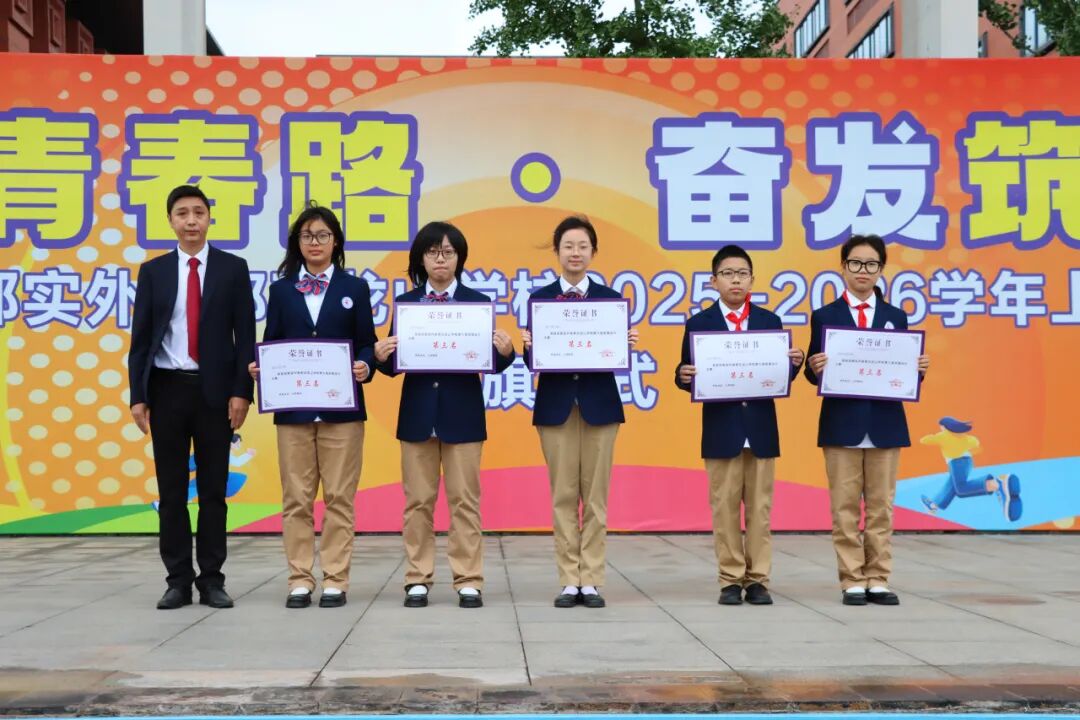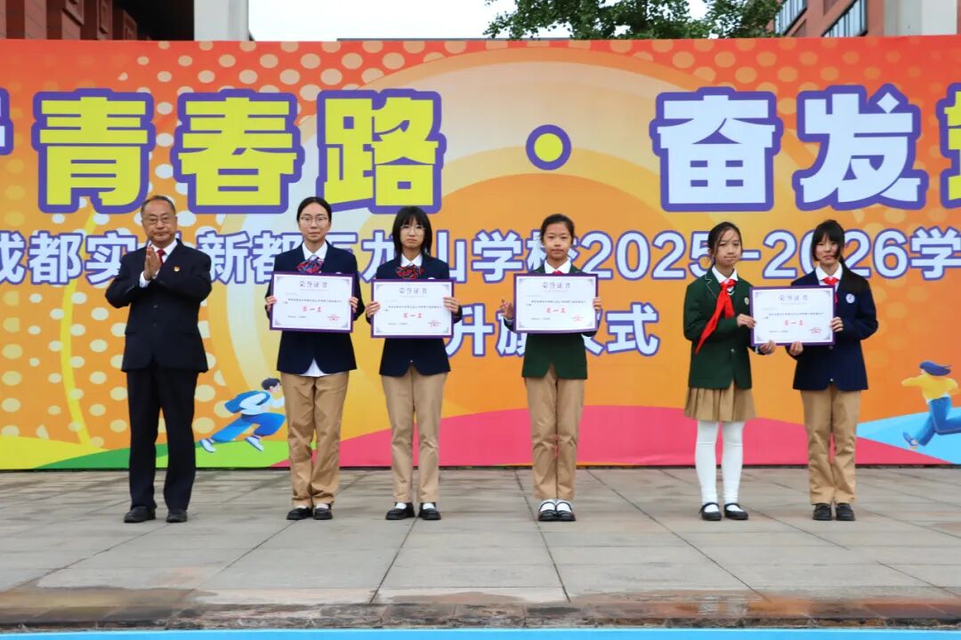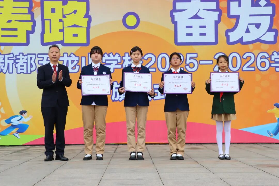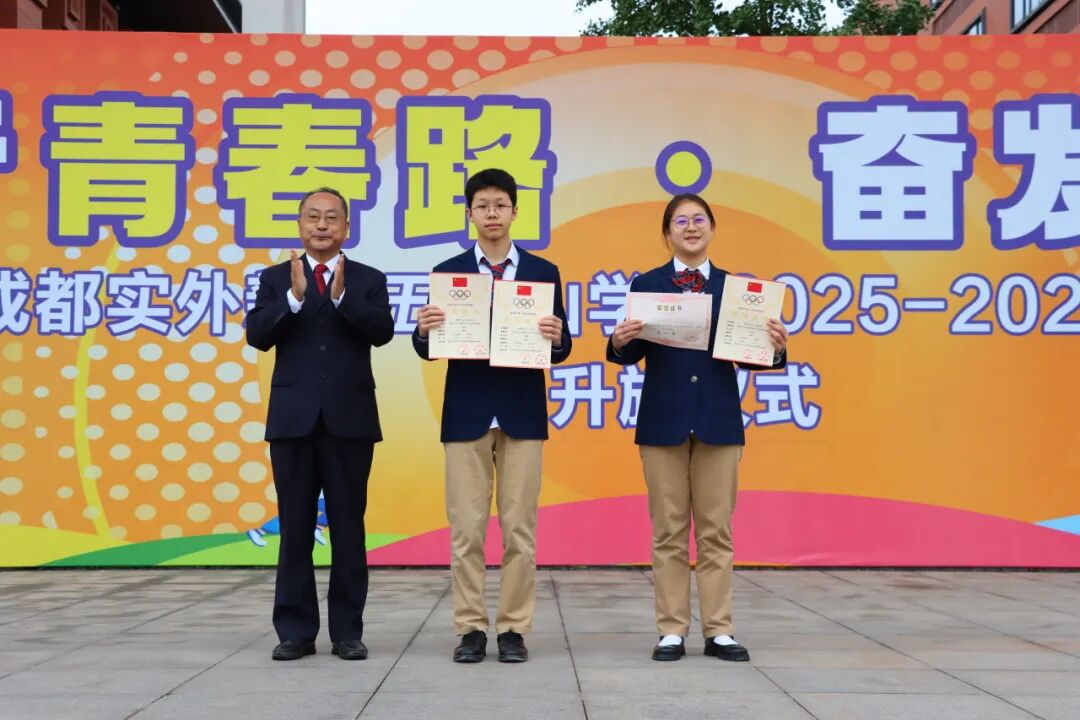 在“成都市青少年体育竞赛‘希望之星’2025成都市青少年(学生)运动会”游泳比赛中,我校高二2班赖昶承同学荣获男子高中组100米仰泳第三名、50米仰泳第六名;高一1班汤钧岚同学荣获女子组100米蛙泳第八名、区游泳比赛第一名的好成绩,我校也荣获区运动会游泳比赛初中组团体总分二等奖。李俊校长为他们颁发证书并表示祝贺。