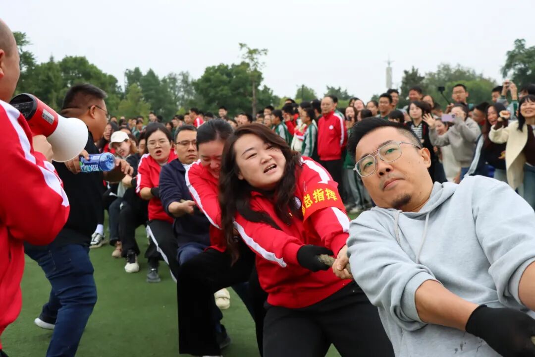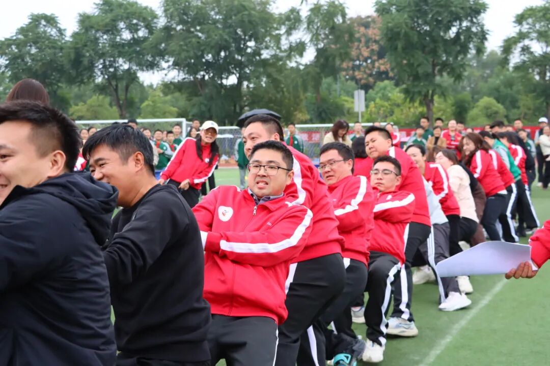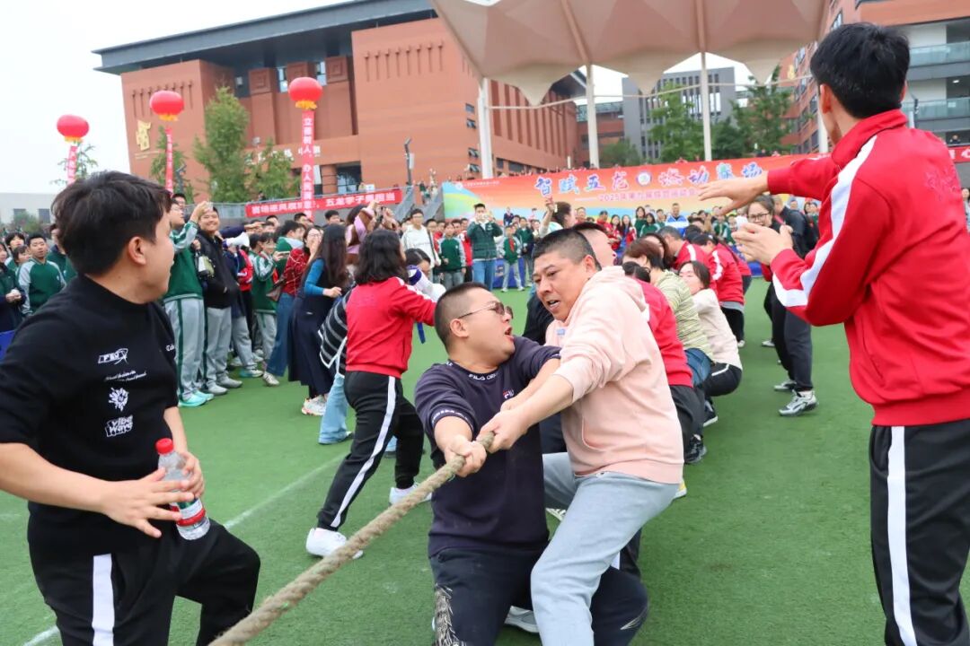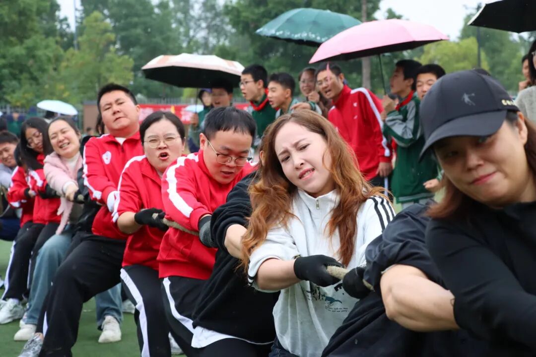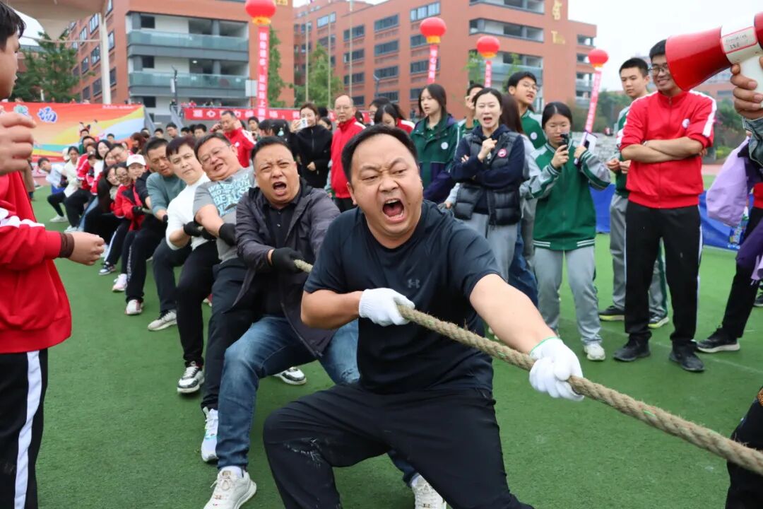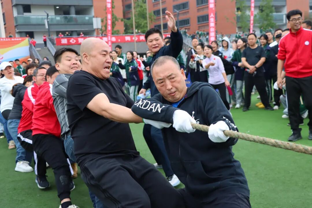 50米接力赛的紧张过后,拔河比赛的激烈对抗来袭,双方队员紧握绳索,身体后倾,使出全身力气,赛场边的呐喊助威声此起彼伏,每一次绳索的移动都牵动着所有人的心,彰显着团结的力量。