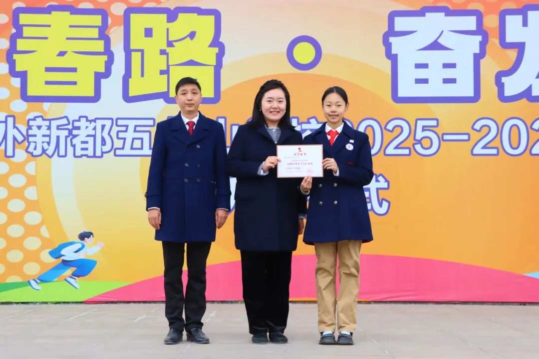 本次升旗仪式上还举行了颁奖典礼。在“新都区2024-2025年少先队”评优中,我校八(5)中队获得优秀少先队集体,校长助理兼学工部长林成臣老师为他们颁奖并表示祝贺。