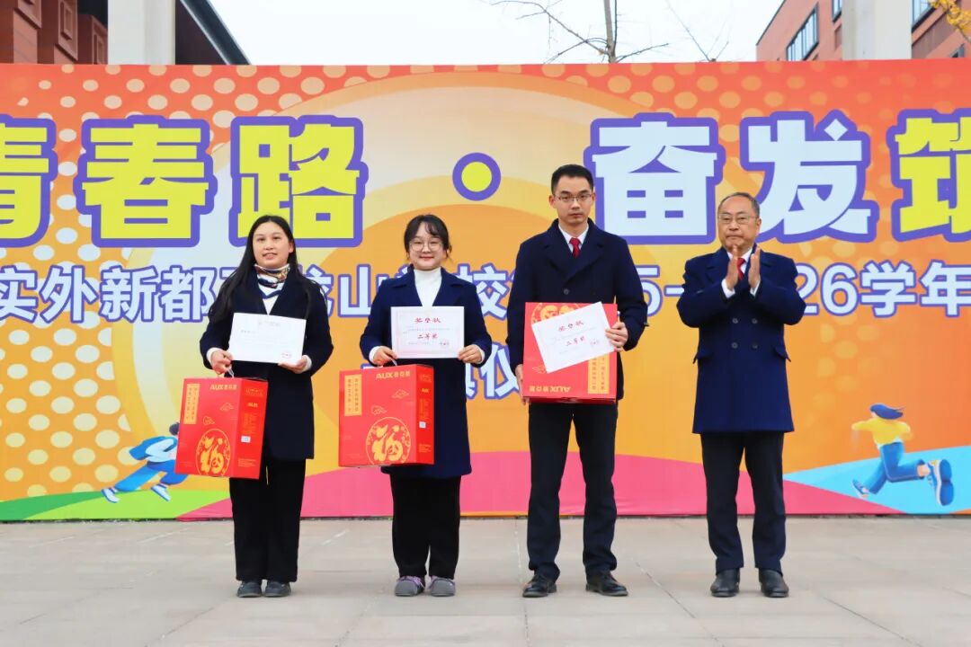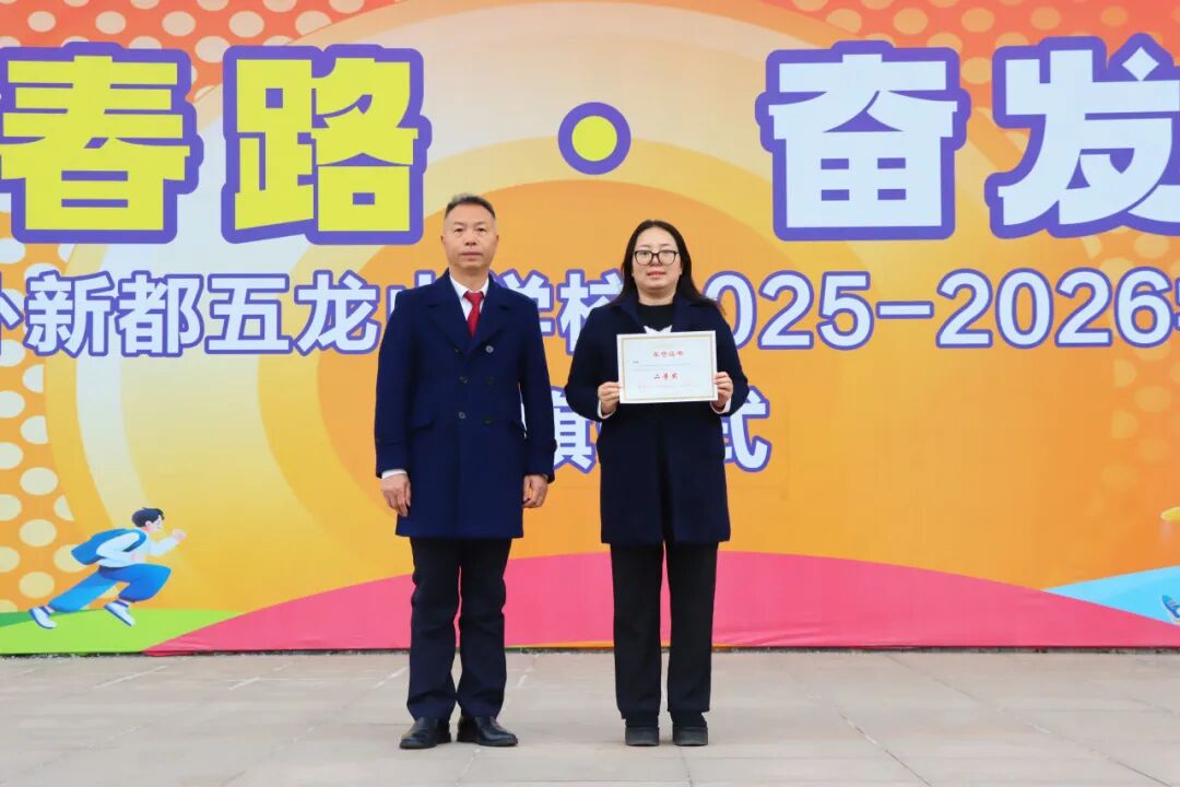 在“新都区2025年少先队辅导员素养能力提升暨少先队辅导员专业技能大赛”中,我校彭婷老师荣获二等奖,张盛副校长为她颁奖,并表示祝贺。