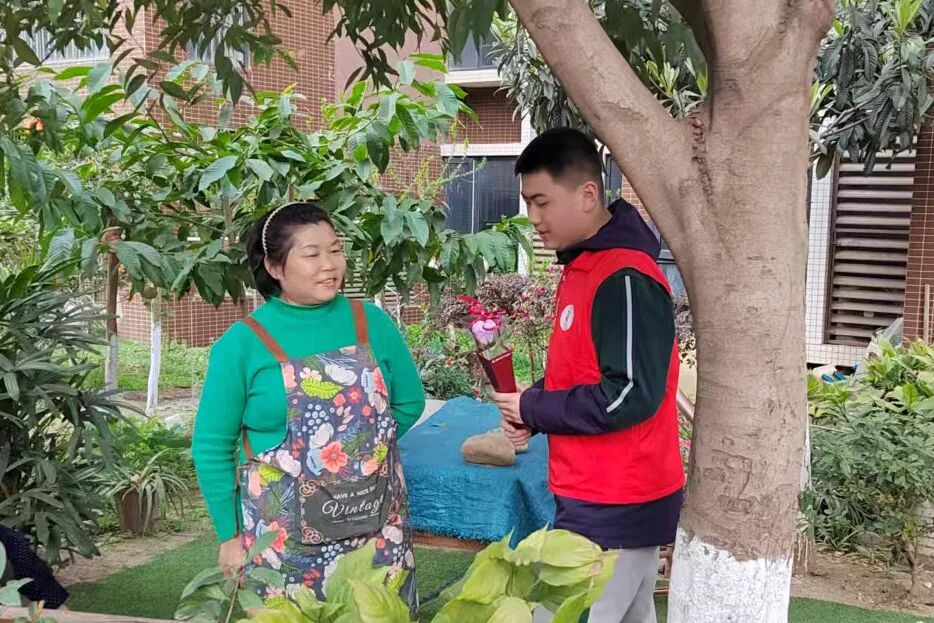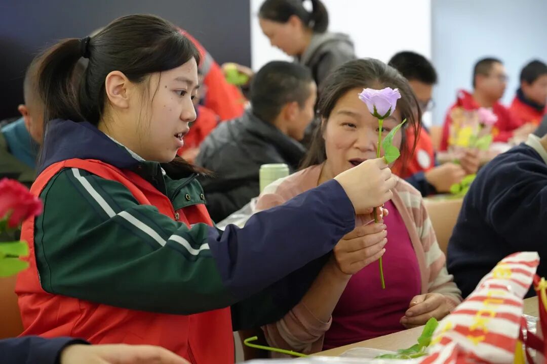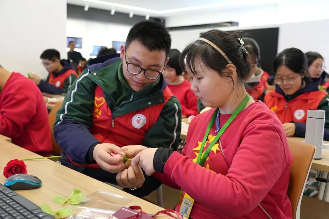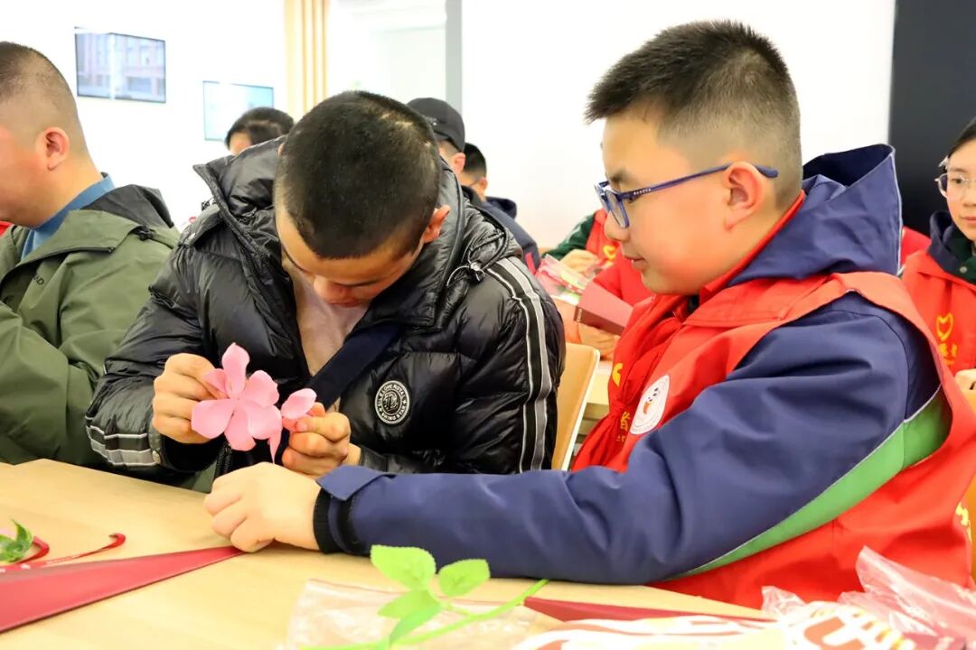下午3时10分,志愿者们与融乐阳光家园的特殊儿童分组合作,共同制作环保手工花。志愿者们耐心地教他们如何用环保材料制作花瓣,孩子们则用纯真的笑容回应着志愿者的关爱。活动现场充满了欢声笑语,志愿者们不仅帮助特殊儿童完成了手工花,更在与他们的互动中感受到了温暖与感动。