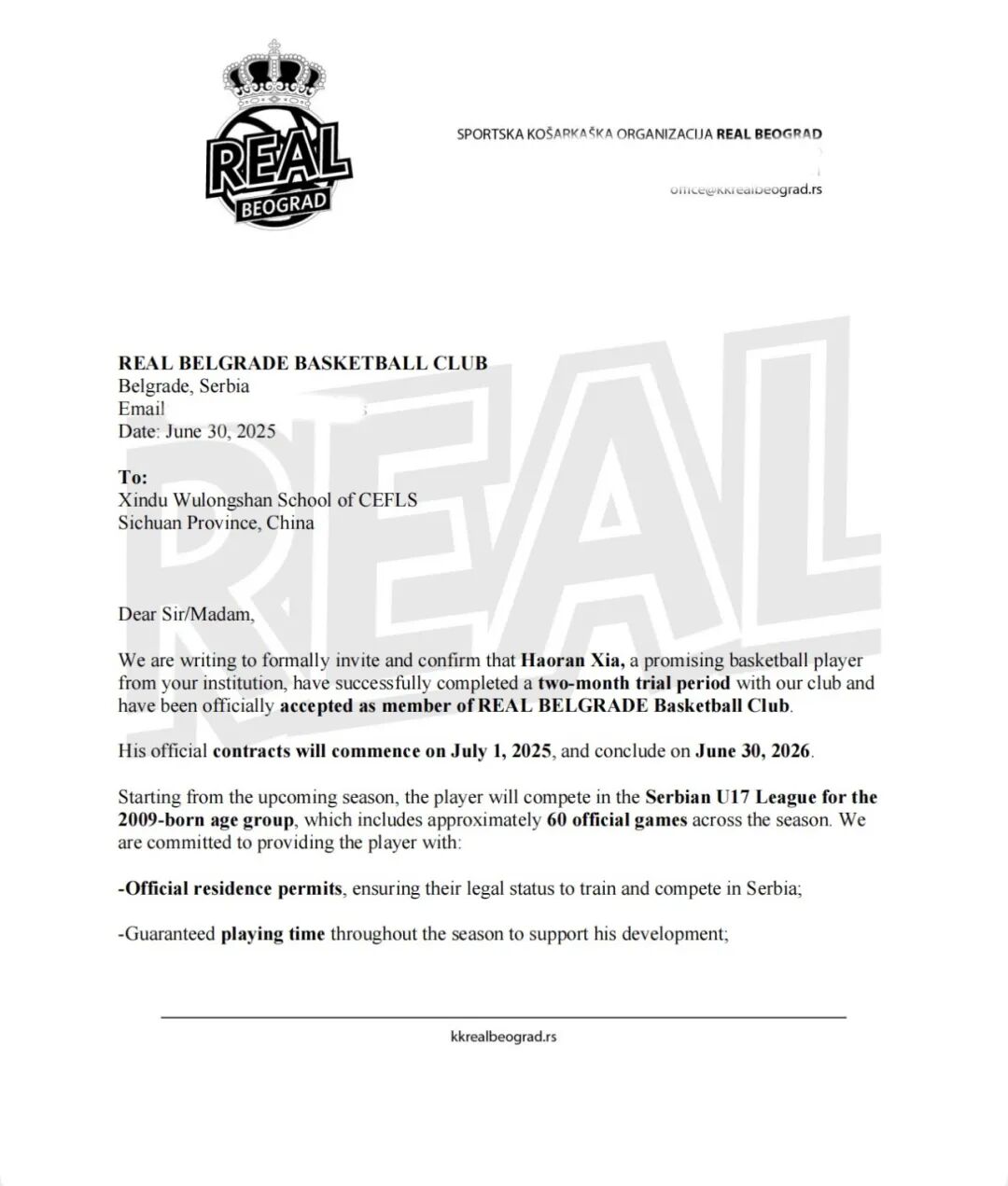 盛夏燃情,捷报飞传!成都实外新都五龙山学校高中一年级学生夏浩然,凭借其闪耀的篮球天赋、过硬的技术实力和在国内外赛场上的优异表现,成功叩开欧洲职业篮球的大门——正式入选塞尔维亚贝尔格莱德皇家篮球俱乐部(KK Real Beograd)U17青年队名单!新赛季,夏浩然同学将身披“皇家”战袍,踏上塞尔维亚国内职业联赛的赛场,开启一段充满挑战与荣耀的欧洲篮球逐梦之旅!这不仅是他个人篮球生涯的巅峰突破,更是我校“体教融合,多元成才”育人理念下绽放的又一璀璨硕果!