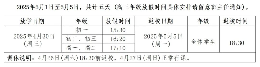 您好,根据《国务院办公厅关于2025年部分节假日安排的通知》的相关规定,为了确保我校学生能在安全、充实且愉快的氛围中度过假期,现将我校关于五一劳动节的放假安排通告如下: