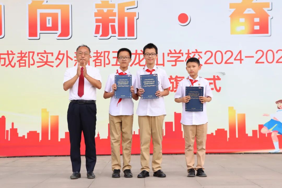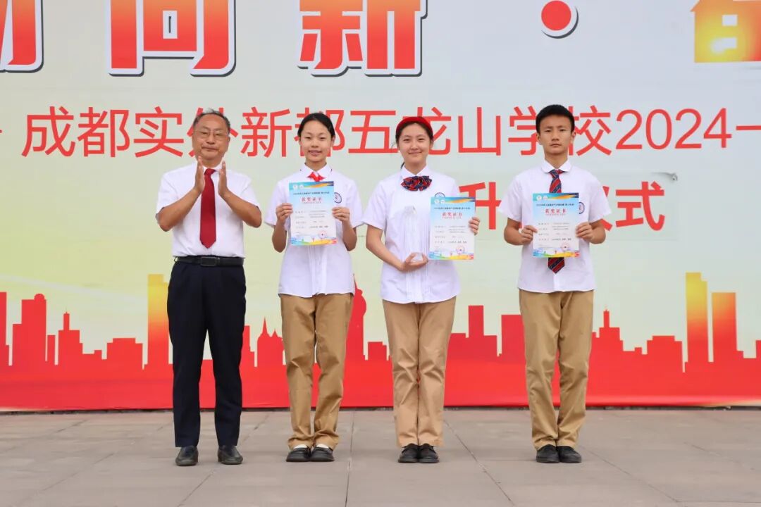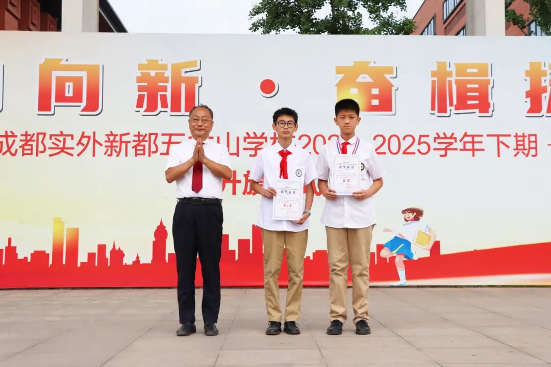本次升旗仪式还举行了颁奖典礼。在今年3月份举行的“2025年度澳大利亚MK袋鼠数学竞赛”中,我校初中部学生积极参赛,3人获得“超级金奖”,5人获得“金奖”,18人获得“银奖”,20人获得“铜奖”,12人获得“数学技能奖”,李俊校长、张盛副校长、代东风副校长、周密校助分别为他们颁奖。