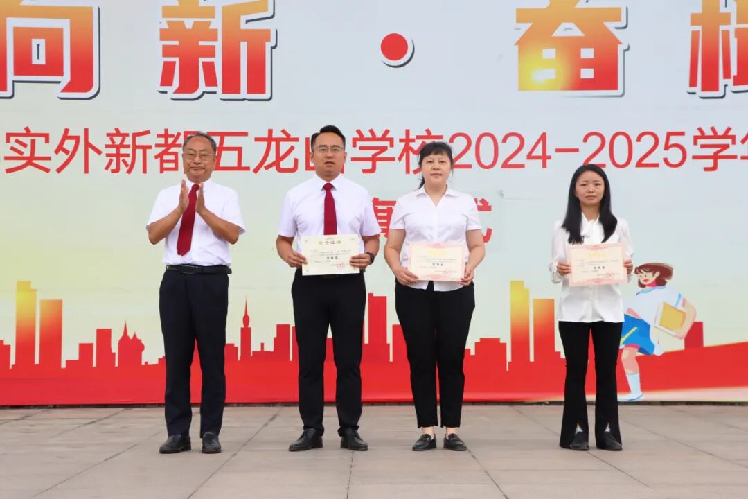 在“2023新都区高中物理三新课堂教学展评活动”中,袁肖老师斩获一等奖,在“2024新都区初中物理新课标课堂教学展评活动”中,肖翠莲老师荣获一等奖。在“成都市第二节物理骨干教师教学展评活动”中,肖翠莲老师荣获一等奖,在“2024成都市青年物理教师第十六届赛课活动(新都)”中,汤廷老师荣获初中组特等奖、成都市二等奖。李俊校长为他们颁奖并表示祝贺。