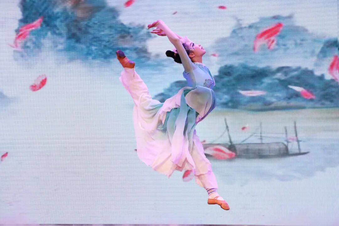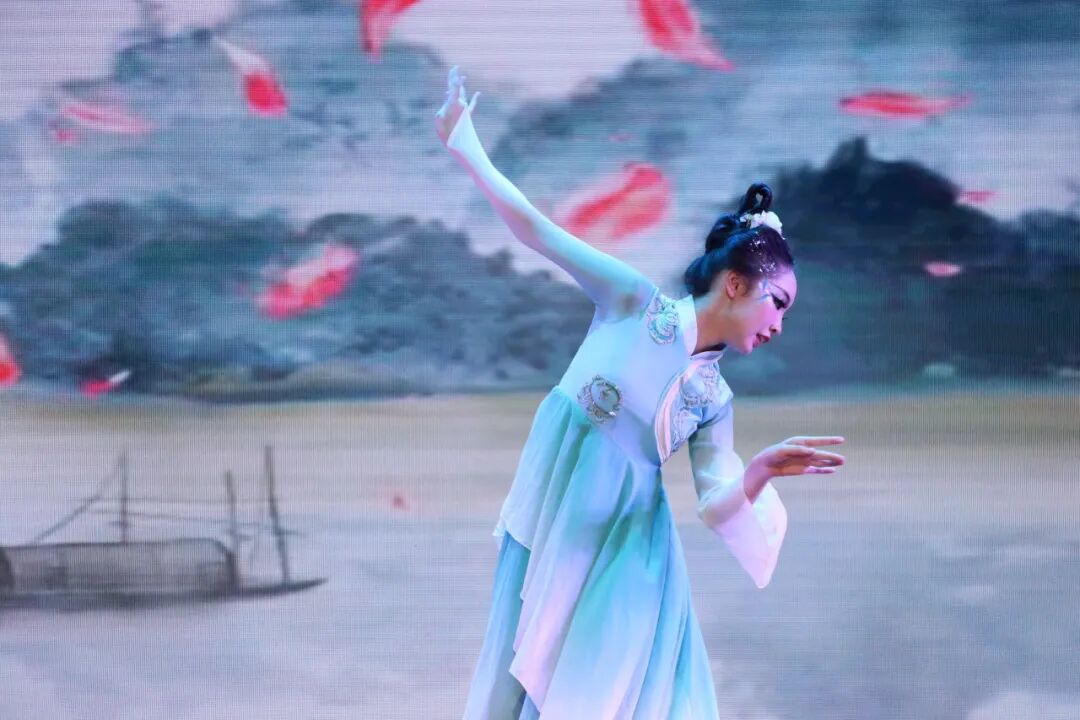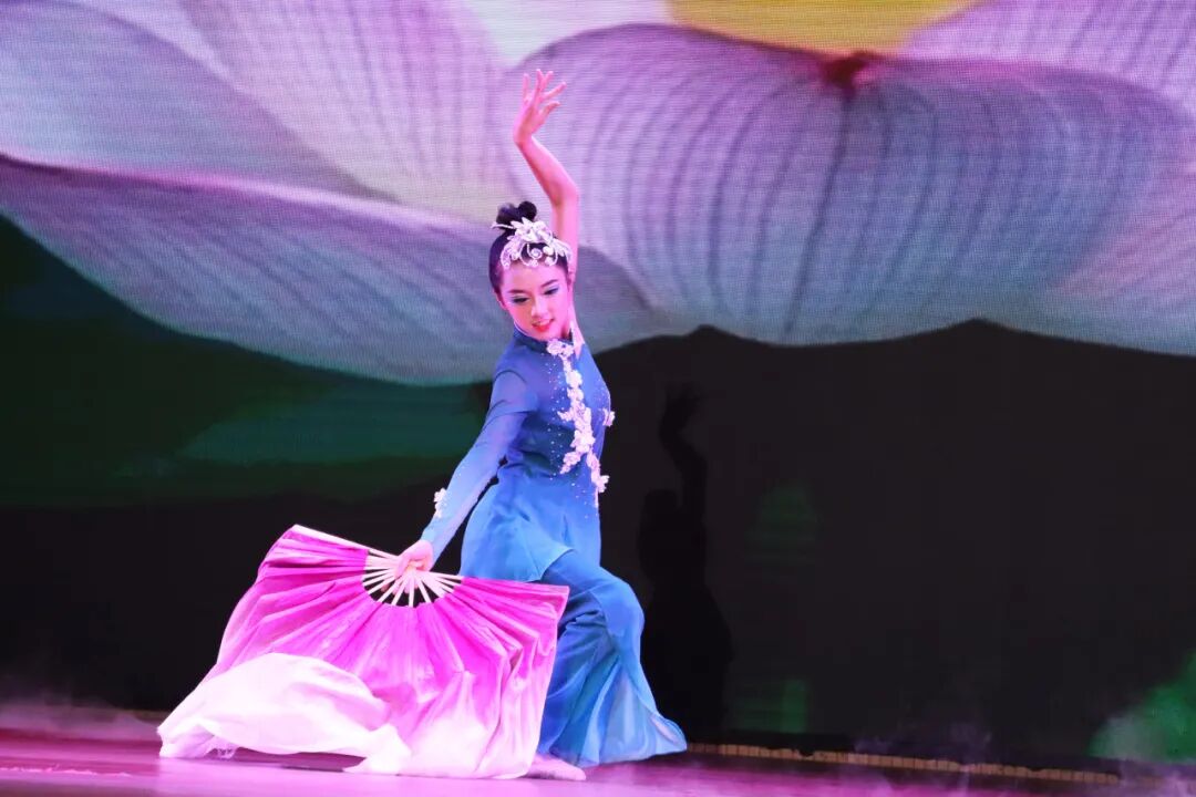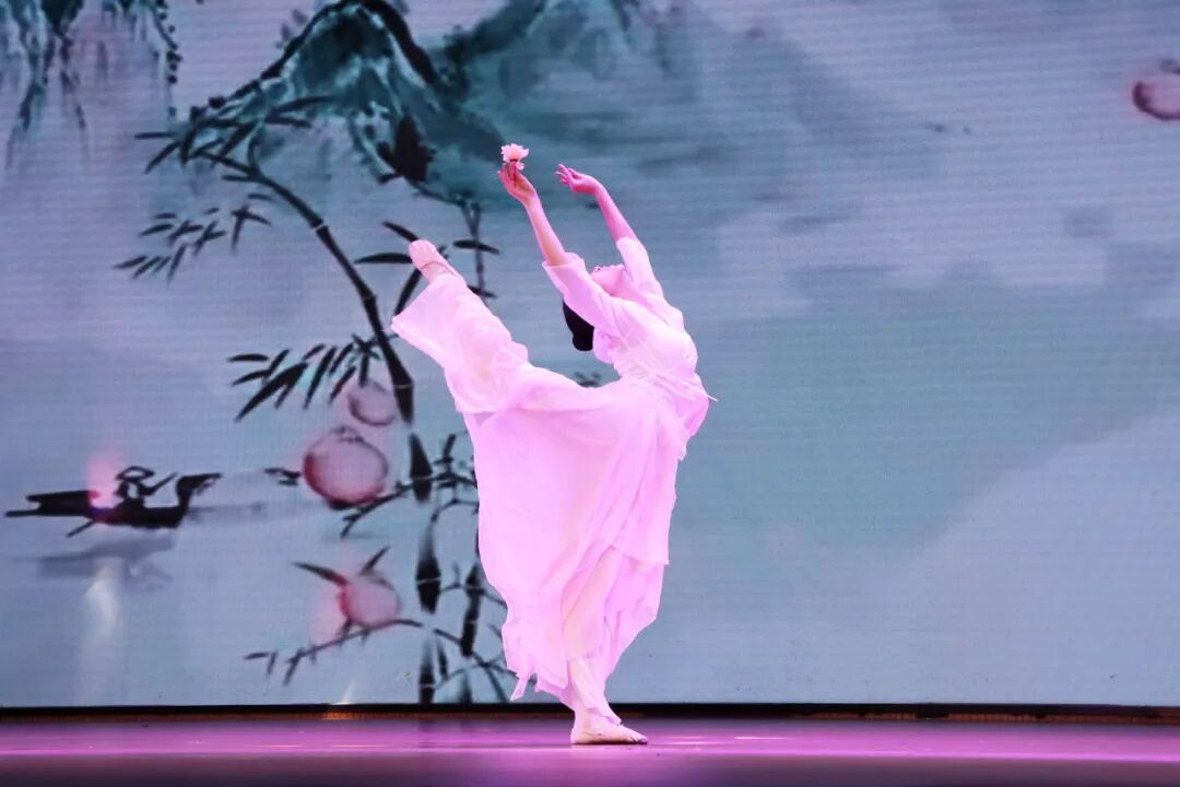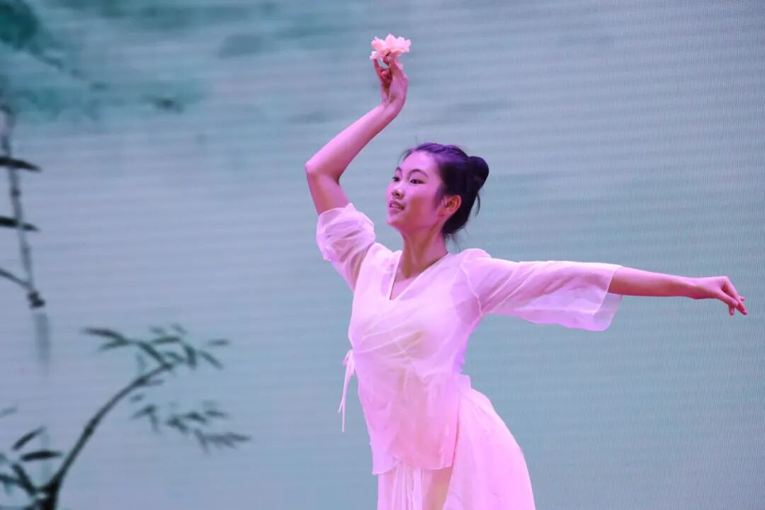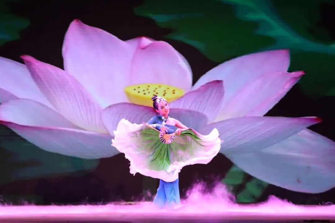 她的身姿优雅而挺拔,如同荷花般亭亭玉立。随着音乐的起伏,她翩翩起舞,仿佛将荷花的婉约与柔美展现得淋漓尽致。她用曼妙的舞姿和细腻的动作,描绘了荷花从含苞待放到盛开的全过程。她的手指轻轻捏住裙摆,如同荷花的花瓣在微风中轻轻摆动,展现出荷花的柔美和生命力。她时而低头含笑,如同荷花在微风中羞涩地低语;时而抬头挺胸,如同荷花在阳光下傲然绽放。