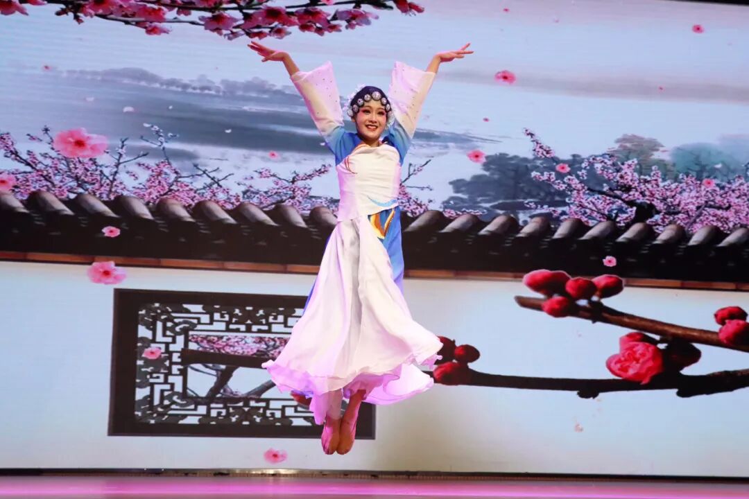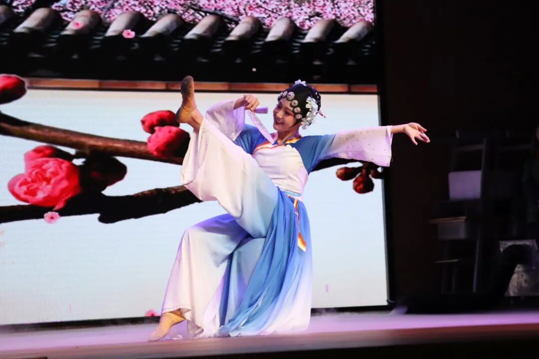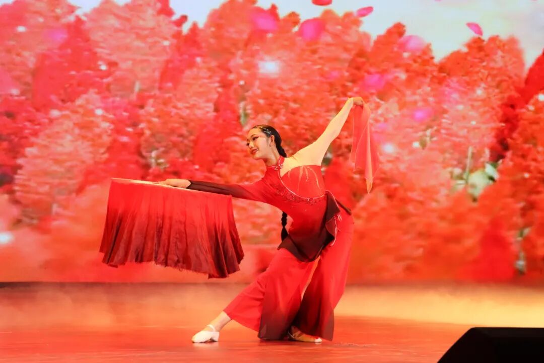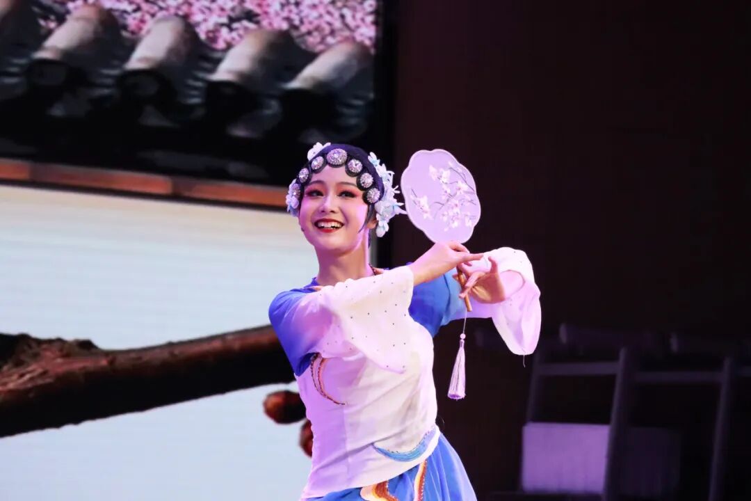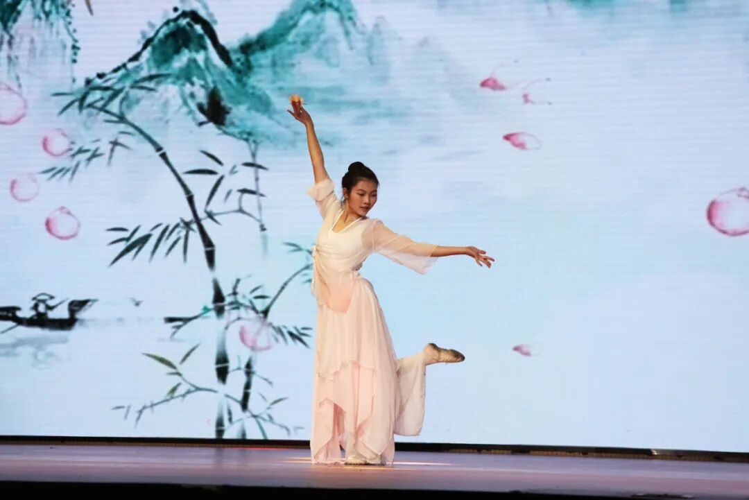 “桃花流水窅然去,别有天地非人间”。随着轻柔悠扬的音乐响起,她轻盈地走上舞台,眼神清澈而明亮,如同山涧的清泉,透出一种纯净而自然的美。她的每一个动作都如同流水般自然流畅,展现出舞蹈的柔美与灵动,将《桃花流水》的意境和情感表达得淋漓尽致,将我们带入了一个充满诗情画意的世界。