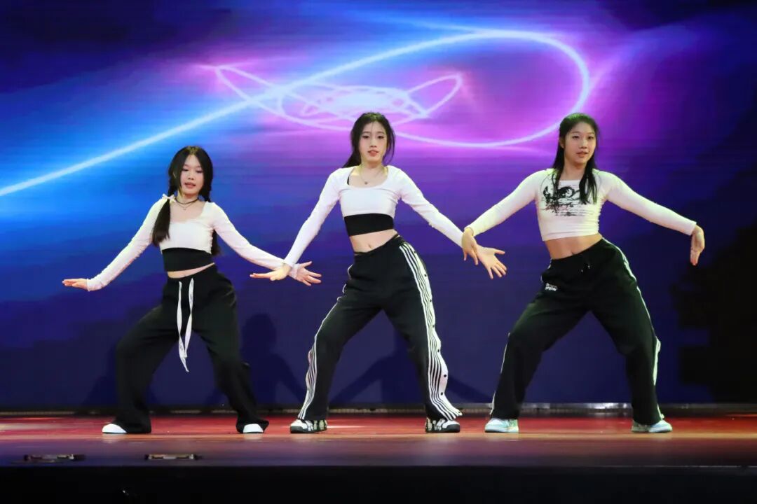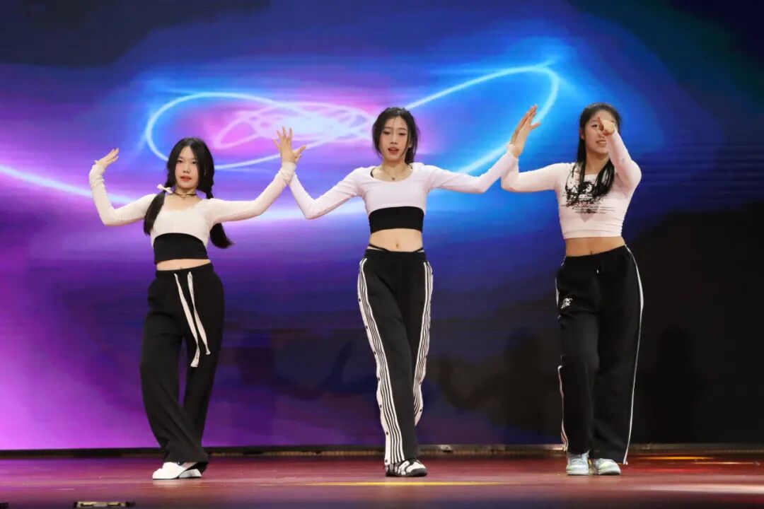 高2022级4班的邓宇淳、邓宇君、庾兆彤同学演绎充满现代感和时尚元素的舞蹈APOP