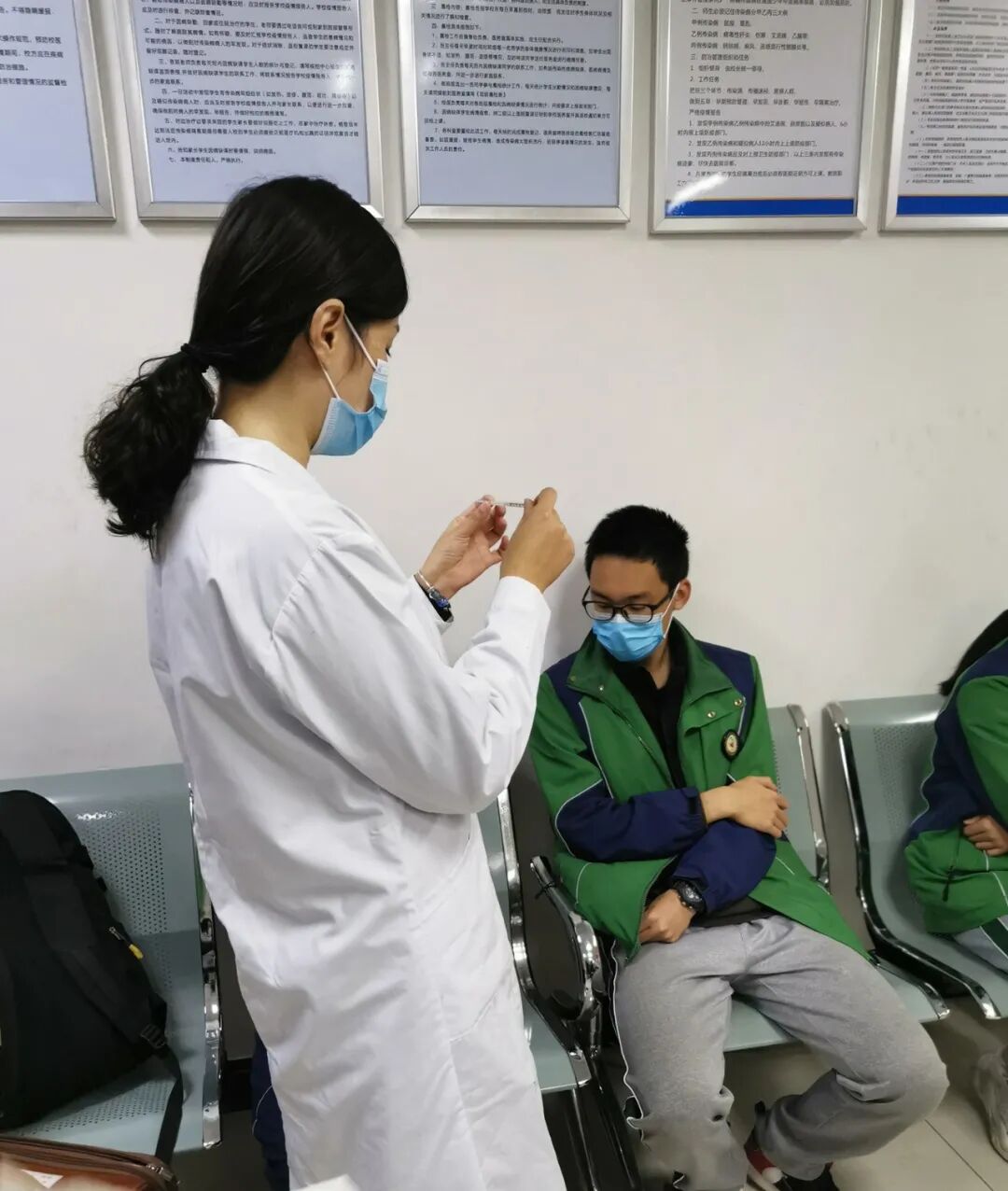 保健室医生对生病学生进行治疗、关护