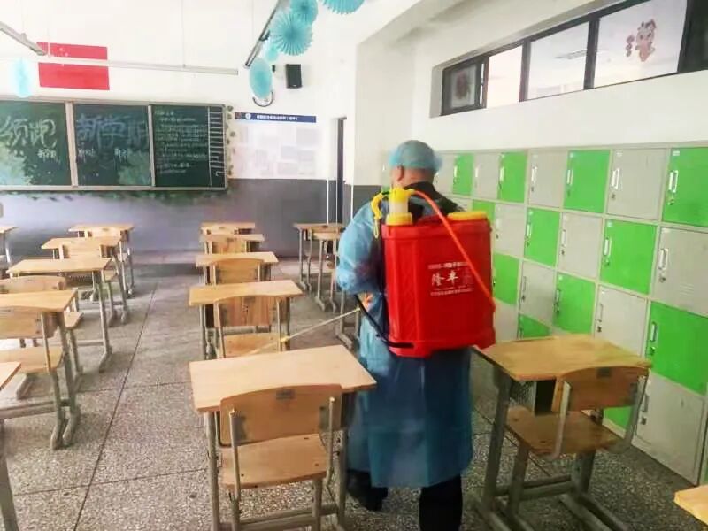 我校后勤工作人员对教室进行消毒