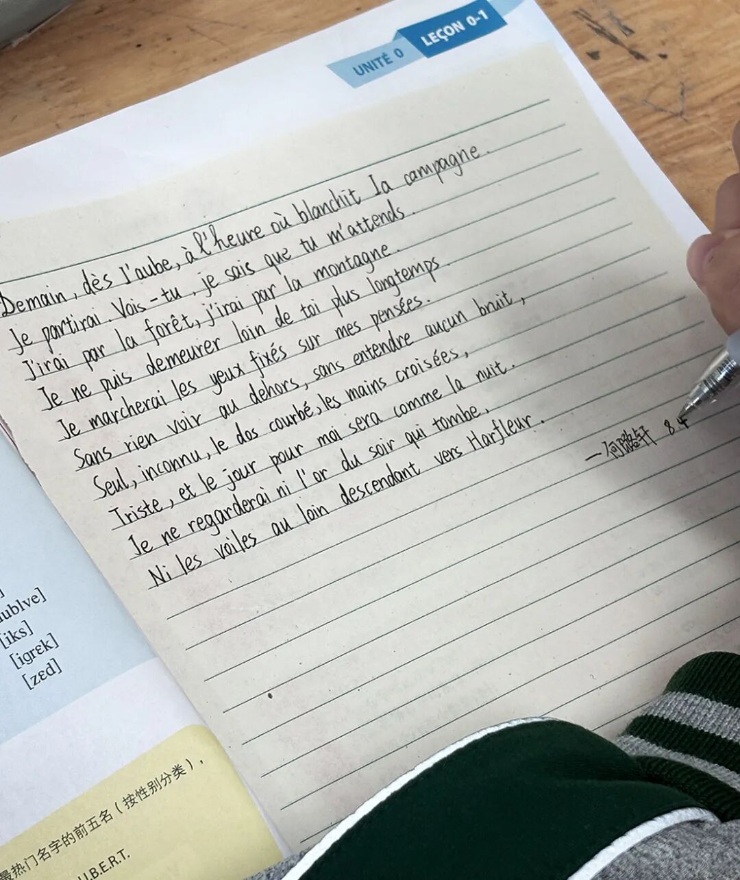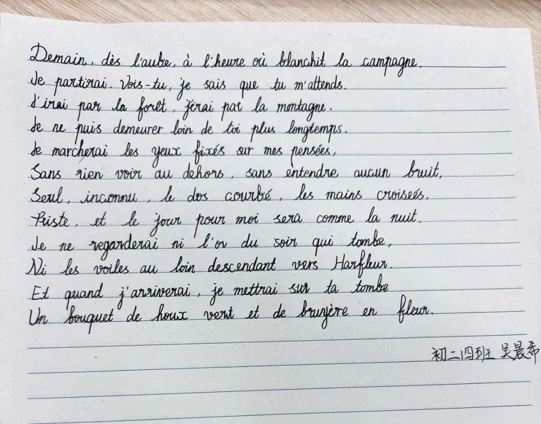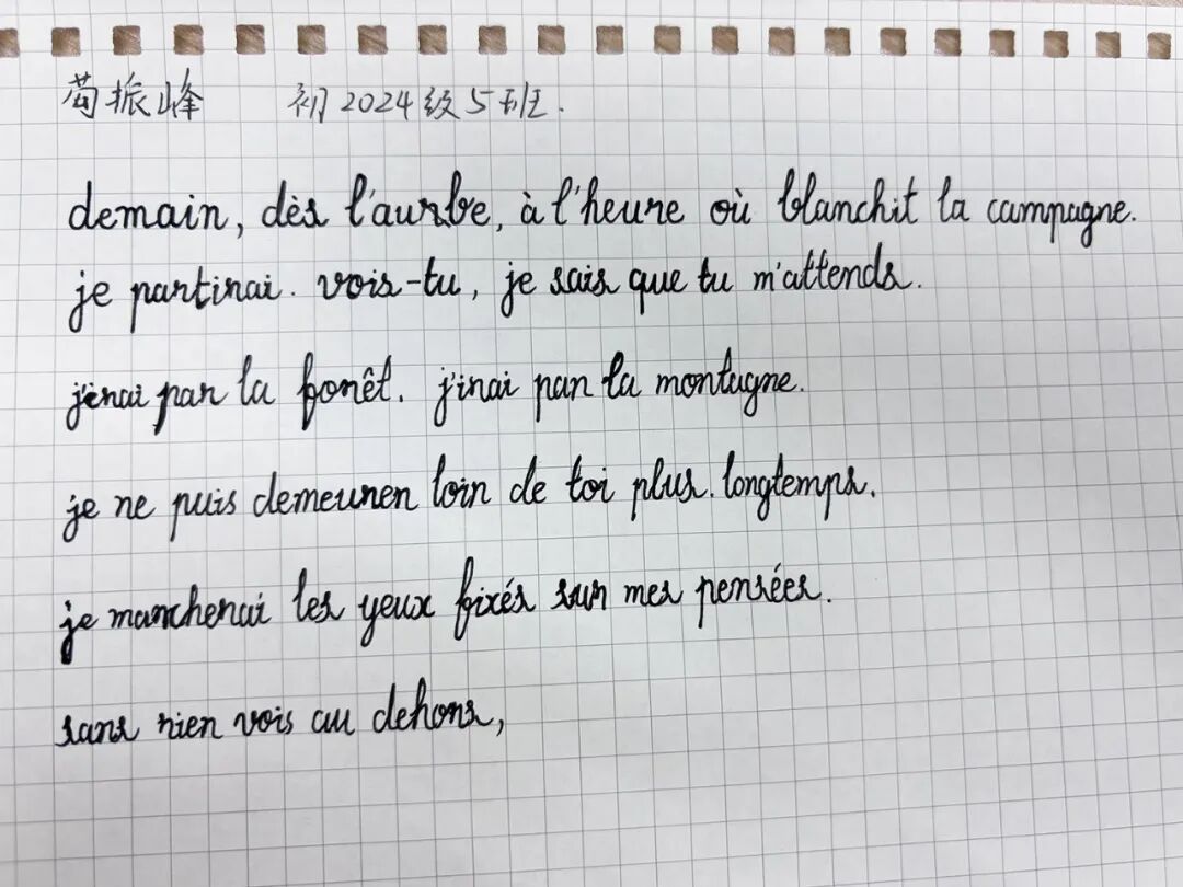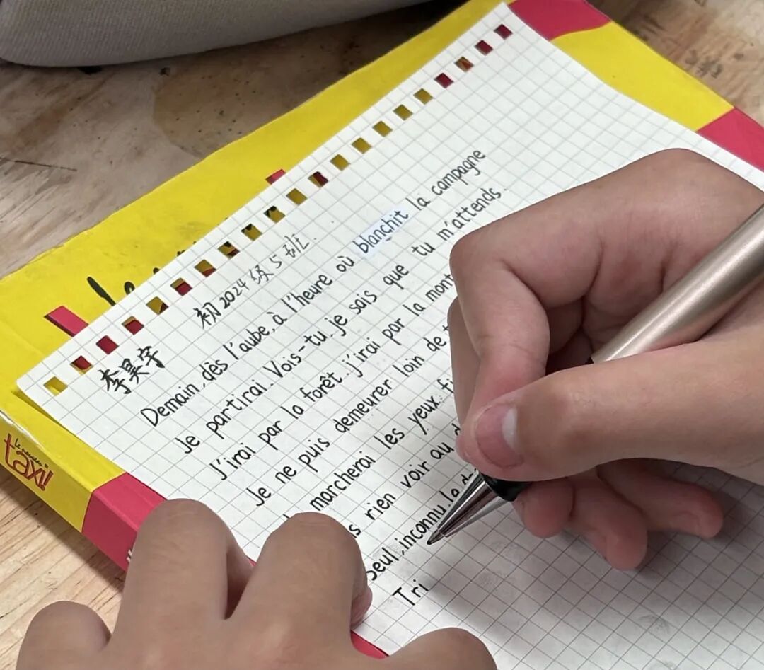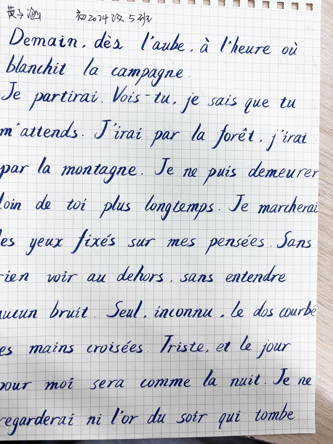 金秋十月,在充满活力与创意的校园里,一场精彩纷呈的法语书写大赛刚刚落下帷幕。本次法语书写大赛以“法语笔端韵,书写雨果情”为主题,在我校初2023级和初2024级英法双语班举行。