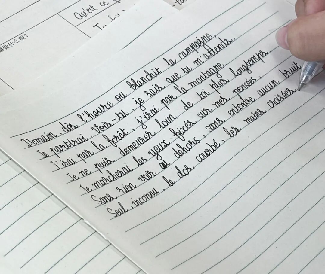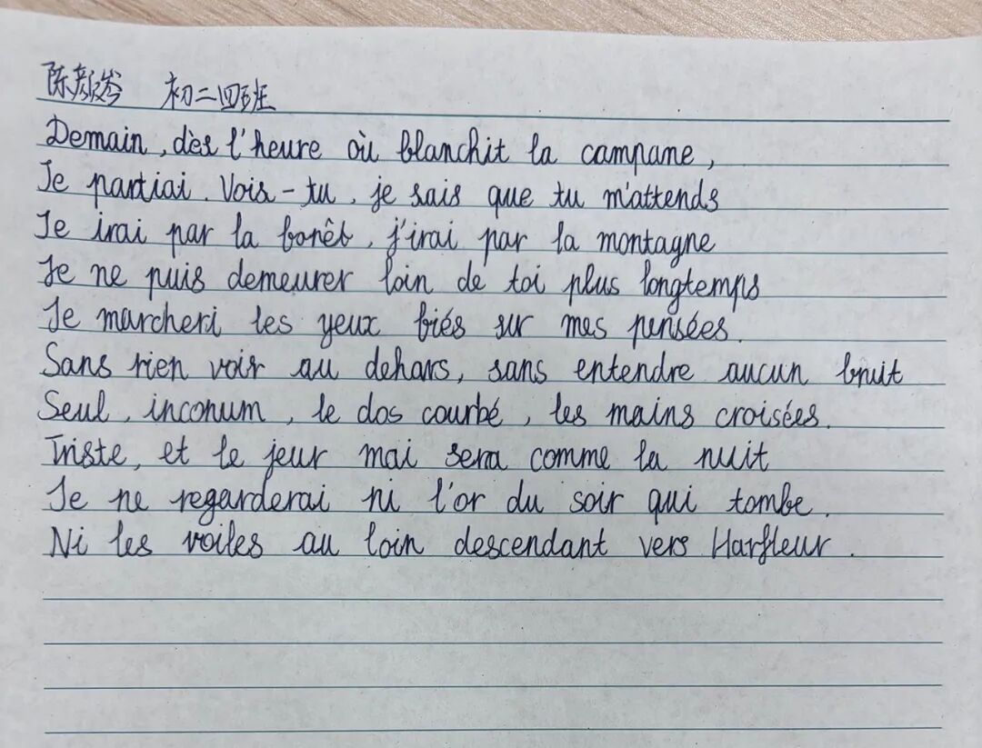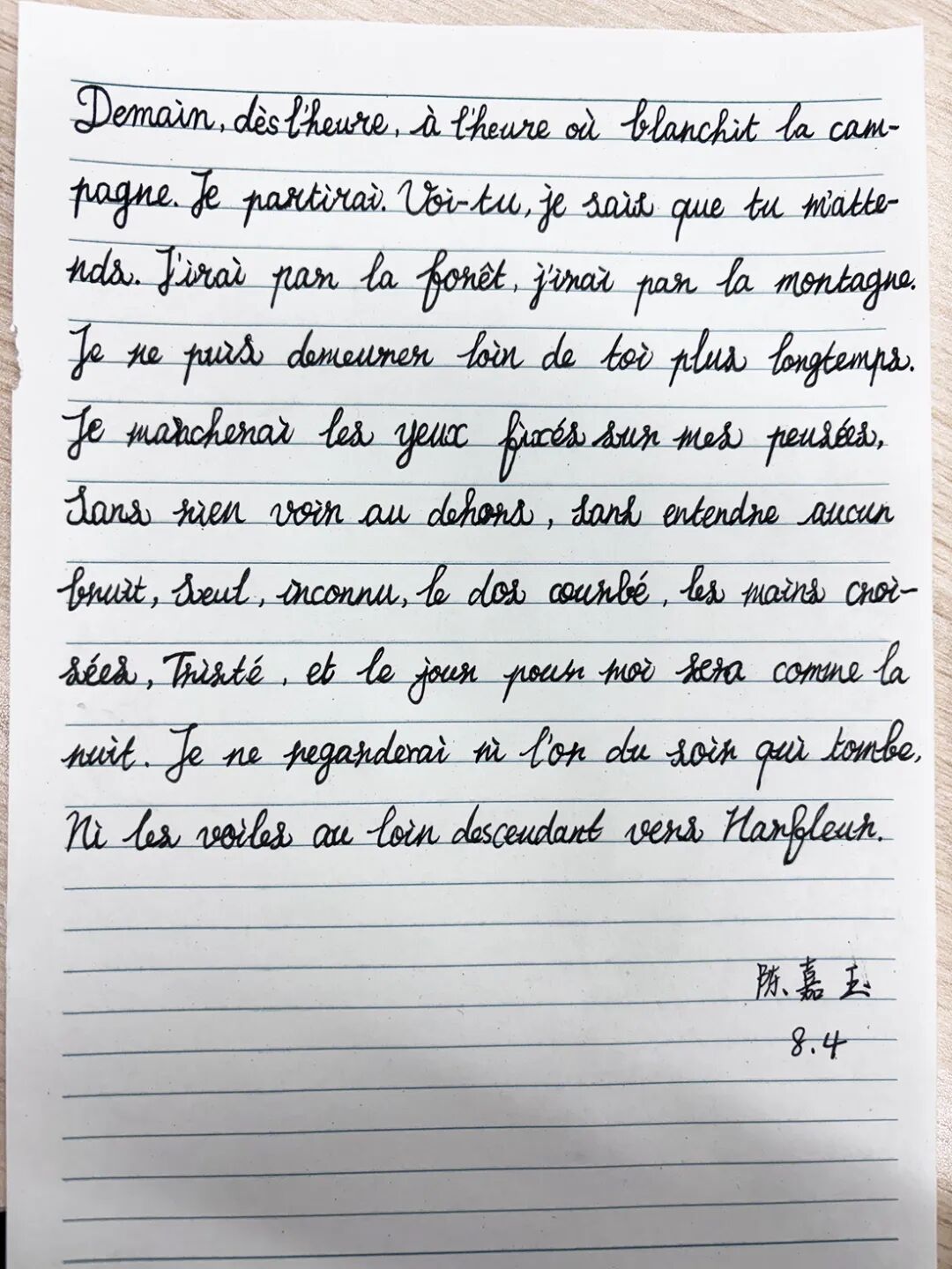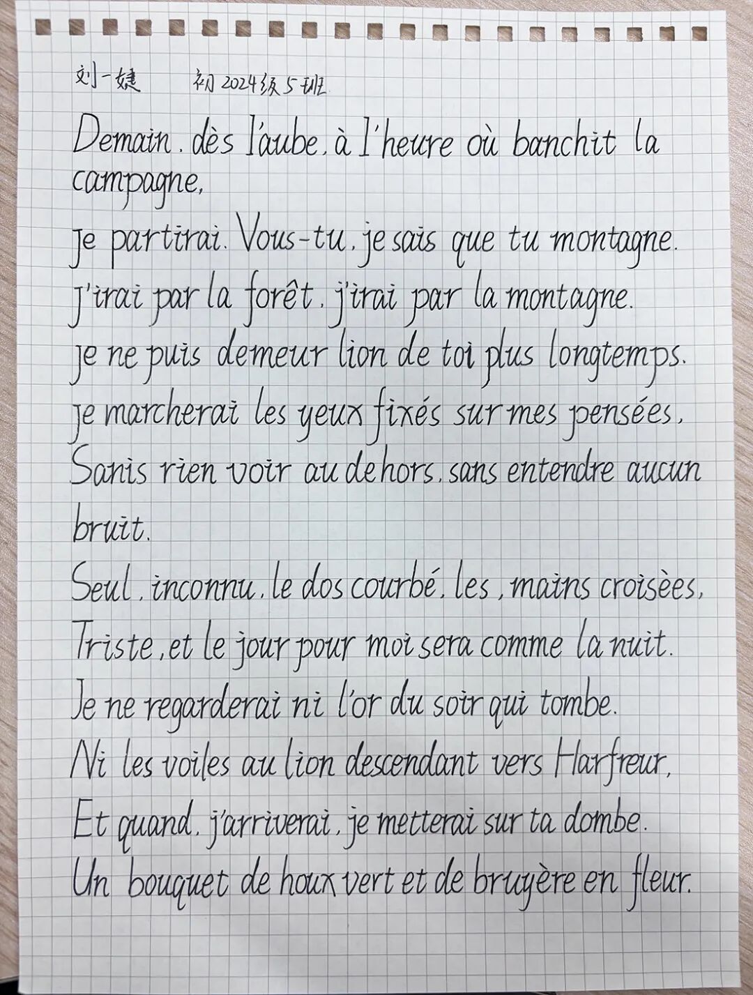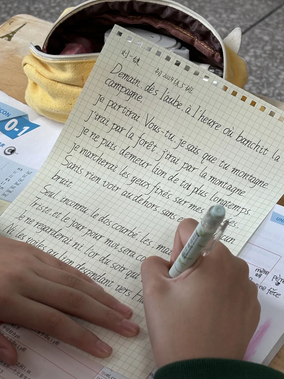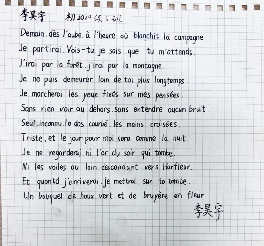 金秋十月,在充满活力与创意的校园里,一场精彩纷呈的法语书写大赛刚刚落下帷幕。本次法语书写大赛以“法语笔端韵,书写雨果情”为主题,在我校初2023级和初2024级英法双语班举行。