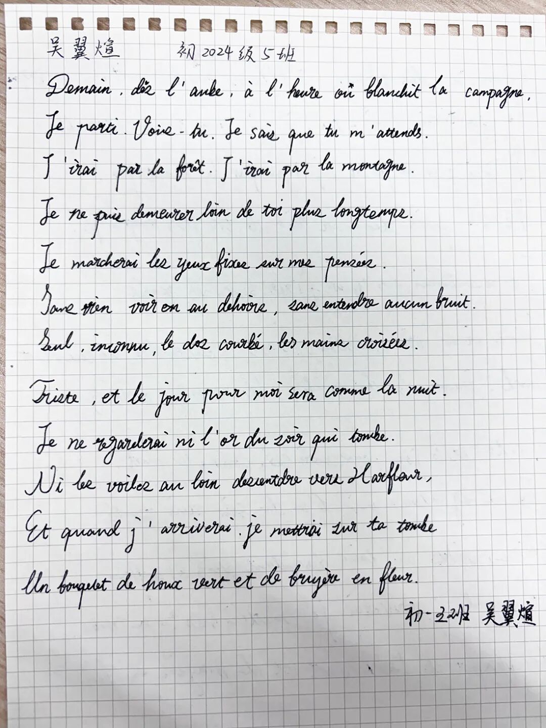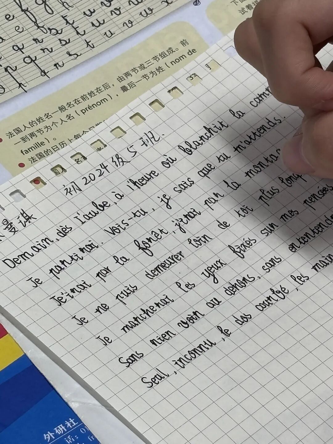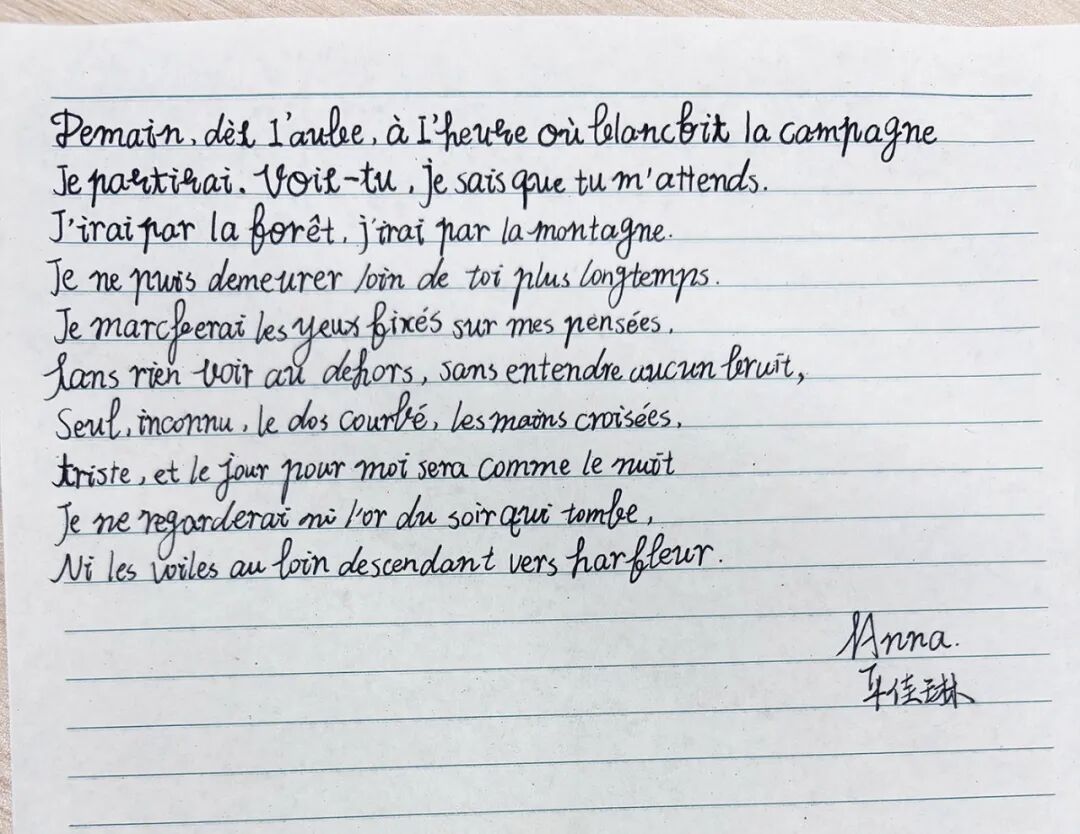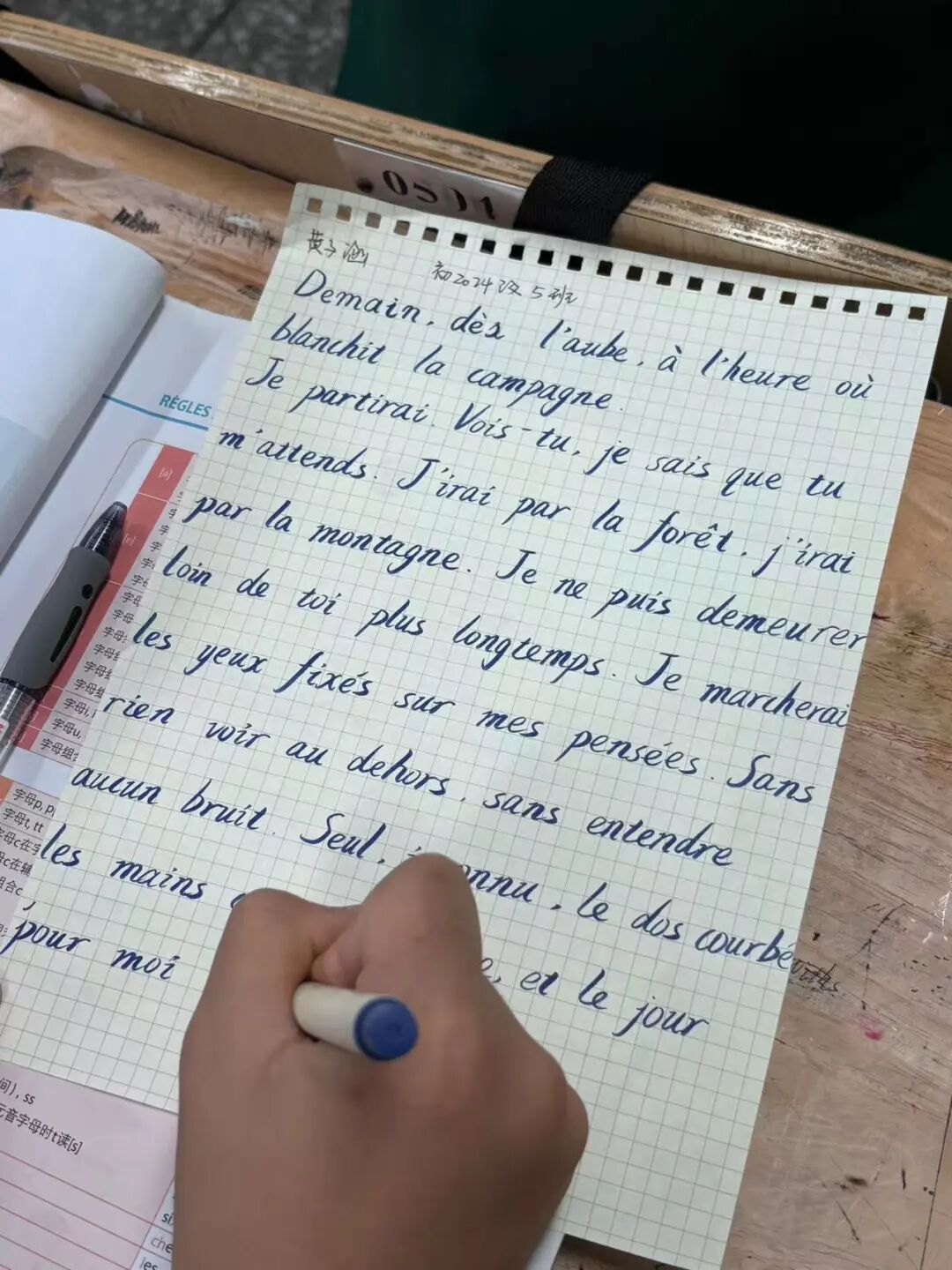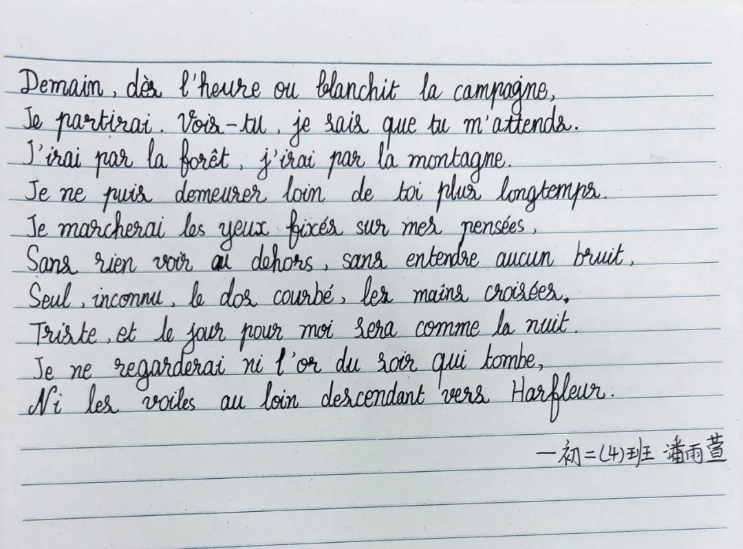 金秋十月,在充满活力与创意的校园里,一场精彩纷呈的法语书写大赛刚刚落下帷幕。本次法语书写大赛以“法语笔端韵,书写雨果情”为主题,在我校初2023级和初2024级英法双语班举行。