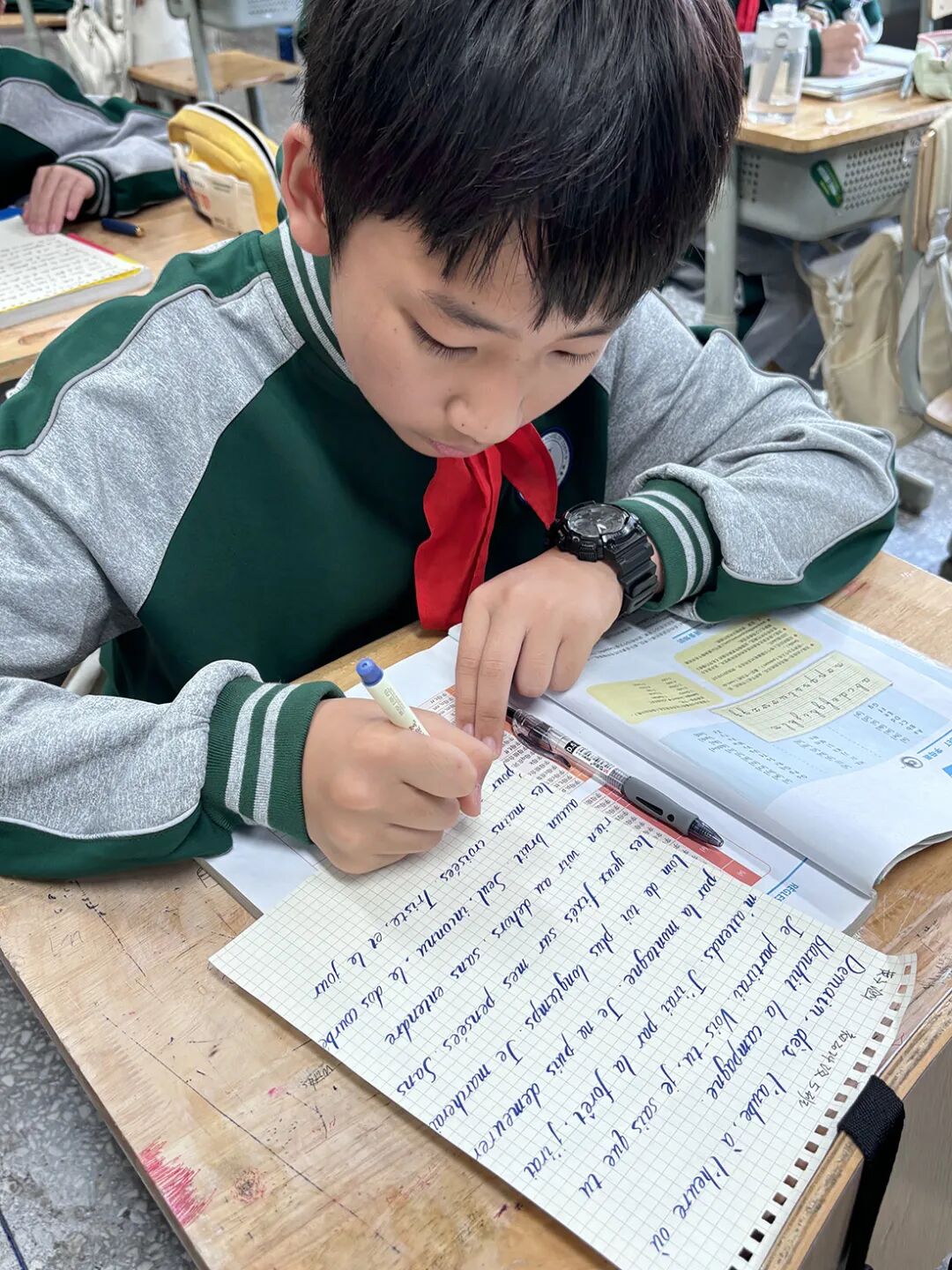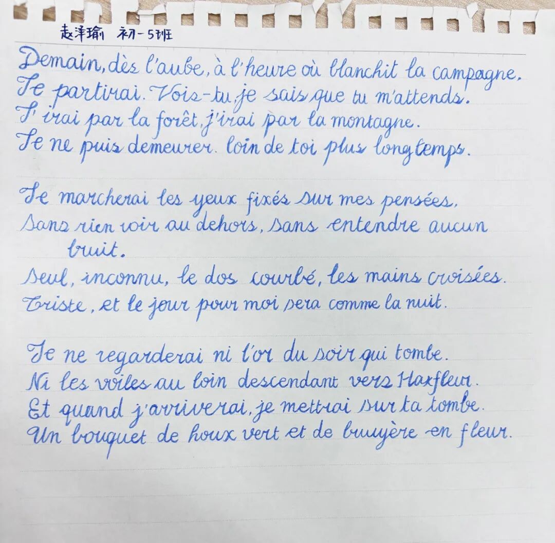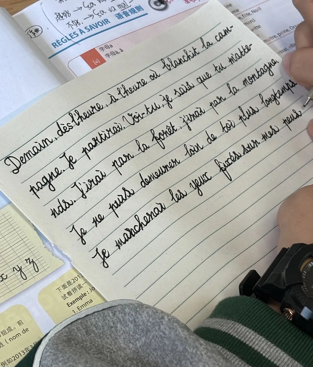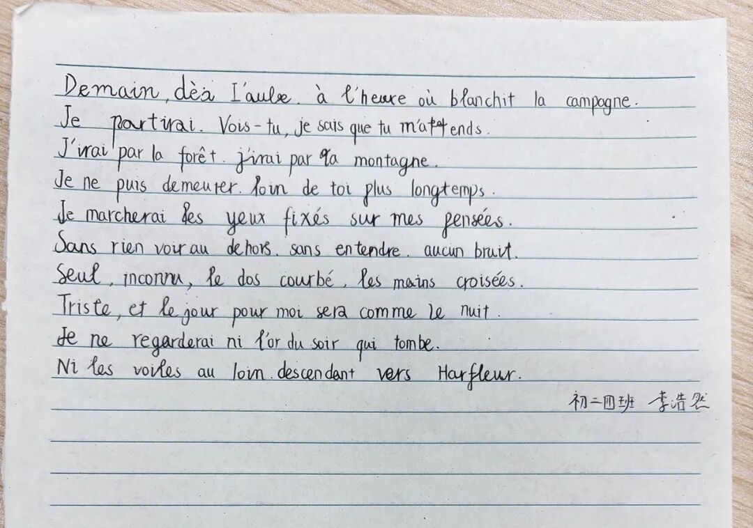 本次法语书写大赛旨在提高英法双语班学生对法语书写的重视,激发同学们探索法国文化的兴趣,同时也为同学们提供一个展示自我风采的平台。比赛现场,同学们坐姿端正,神情专注,全情投入,一笔一划地书写着优美的法语诗句,用心书写着每一个法语字符。在同学们的笔下,法语字母仿佛跳动的音符,组合成了一幅幅精美的法语书写作品。