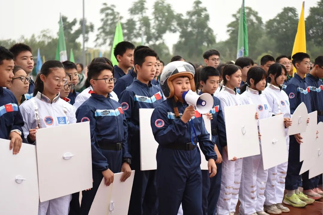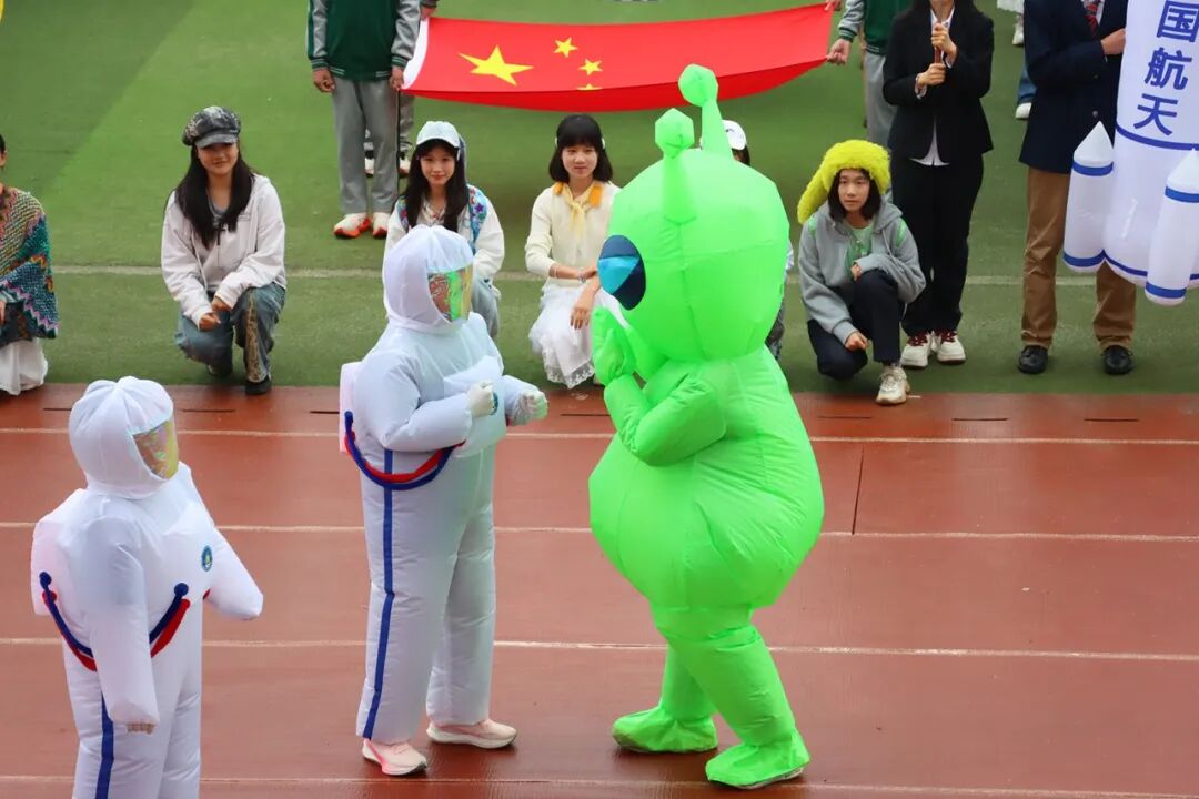 初二学子:他们以“科技与时代”为主题,展现“格物致知”的探索精神。初二(1)班“火箭升空”表演,致敬航天精神;初二(2)班《时代轨迹,中国速度》,从“绿皮火车”到“和谐号”,演绎中国科技的跨越;初二(3)班“蛟龙号”主题,以蓝色服装模拟海洋,展现“中国深度”;初二(4)班“聚龙班”,从“嫦娥奔月”到“天宫筑梦”,续写航天传奇;初二(5)班“新能源战队”,以“知识为电池,汗水为清洁能源”,诠释绿色创新。每一个主题,都是“唤醒生命内力”的实践——让学子在探索中爱上科技,在演绎中树立志向。