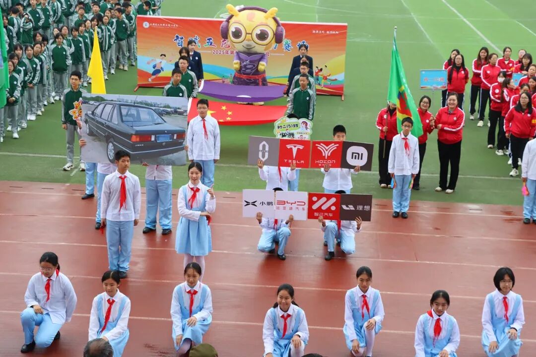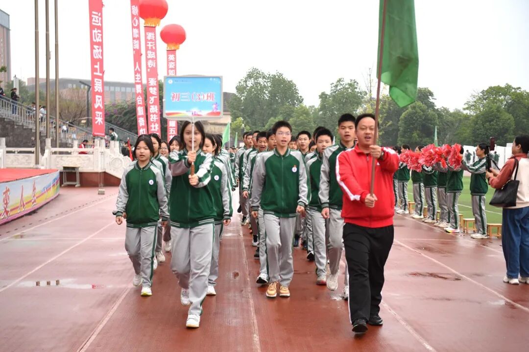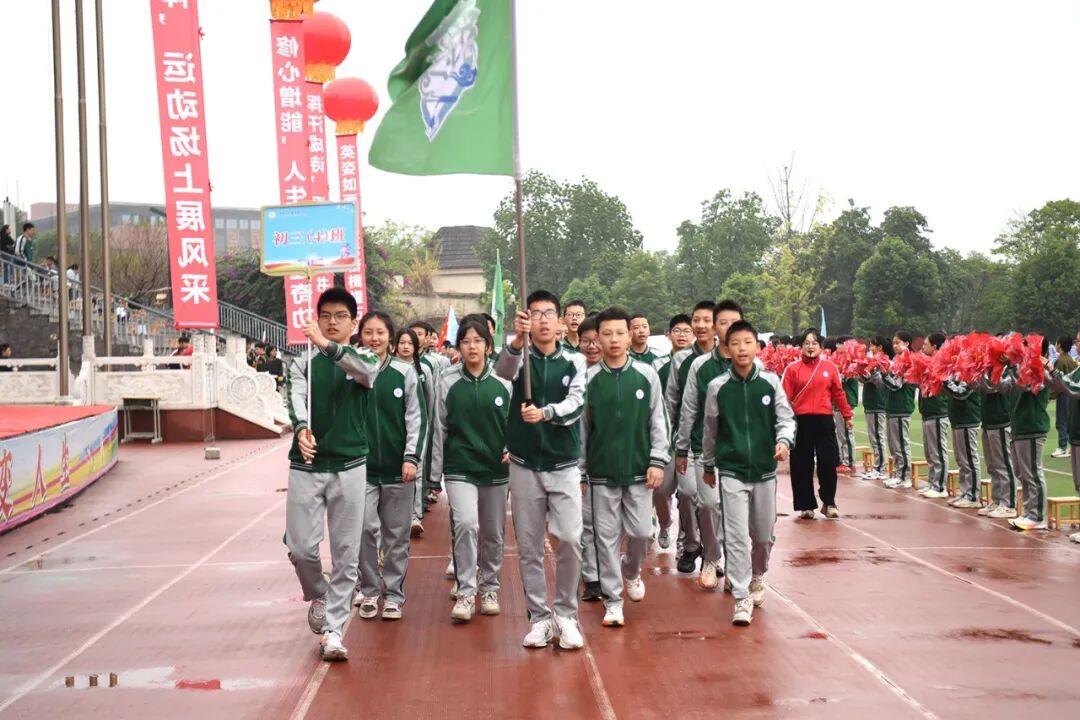 初三学子:作为即将毕业的“学长代表”,他们的入场满是“智慧青年”的担当。初三(3)班“21朵玫瑰与24条蛟龙”组成的战队,以“智赋五龙,谁与争锋”为誓言;初三(4)班“玺越班”以“青春为玺,梦想为帆”,誓要超越自我;初三(5)班“向日葵般的少年”,用“奔跑的足迹描绘青春轨迹”。他们在赛场上的宣言,正是“培养终身发展力”的成果——既有冲刺的勇气,更有拼搏的底气。