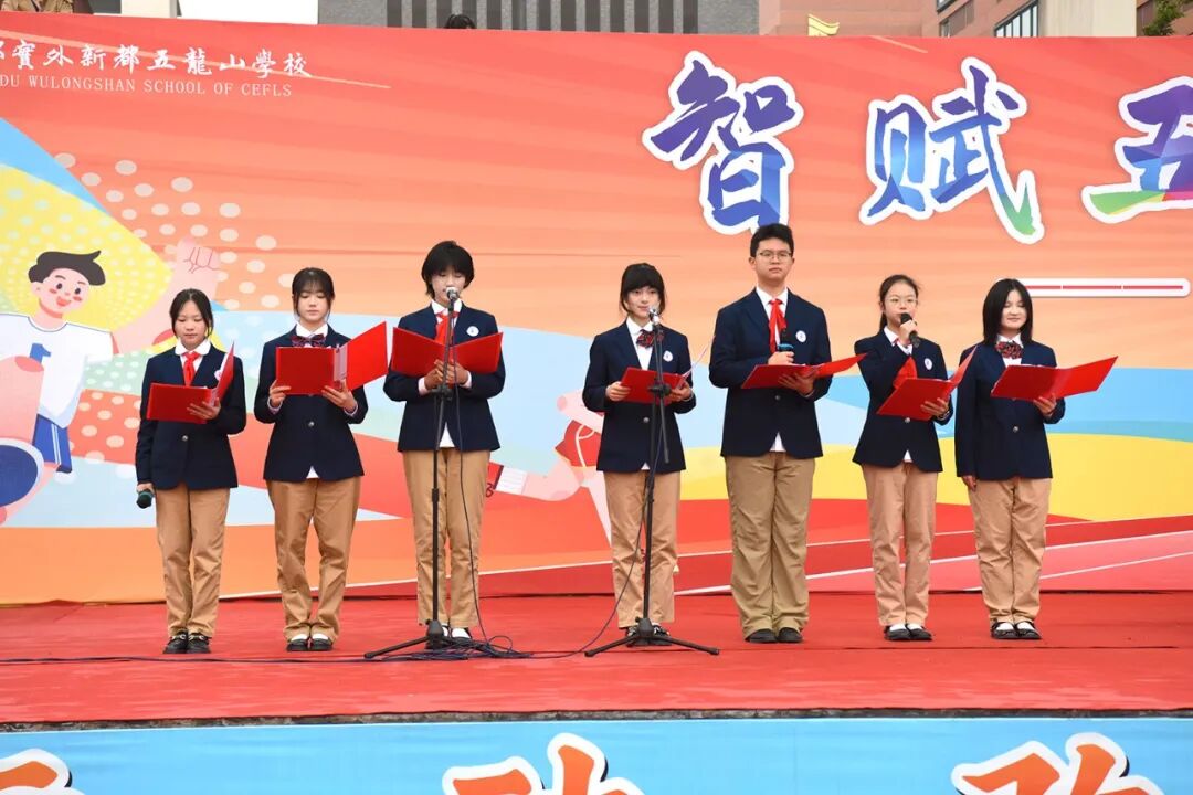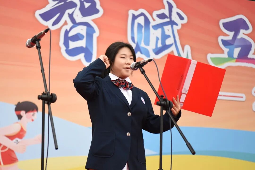 “体育改造大脑,运动改变人生!”随着杨宸瑜同学的中文宣言响彻赛场,戴嘉怡的中文、方晨瑜的英语、周夕恩的德语、蒲铭璐的日语、鲁津菁的韩语、杨若初的法语、杨宸瑜的西班牙语依次接力,七种语言交织成跨越国界的邀请。这不仅是校园国际化特色的缩影,更呼应了学校“文理兼备、中西合璧”的办学特色——在运动的舞台上,五龙学子以开放的姿态,将青春梦想与世界对话,让“格物致知”的探索精神,从书本延伸到赛场的每一寸土地。