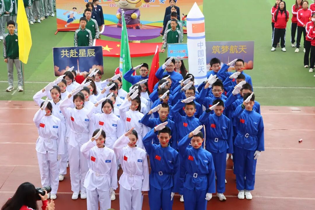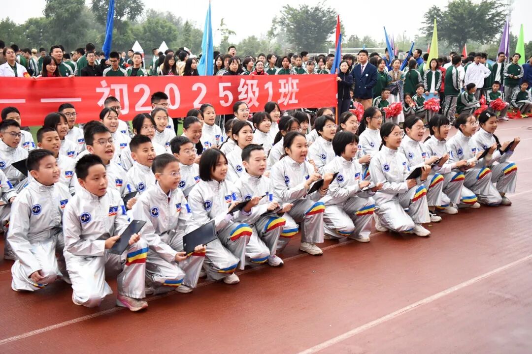 少年班与初一学子:他们是校园的“未来之星”,满是“懵懂少年”向“智慧青年”蜕变的朝气。少年(1)班以“机器人元素”呼应科技强国,让奥林匹克精神与强国梦想交汇;少年(2)班“毓秀班”以“不卑不亢,奋发向上”为座右铭,誓要乘风破浪;少年(3)班《太空科技梦》,用银蓝服饰与星光道具,演绎对宇宙的向往;初一(1)班“步履铿锵,斗志昂扬”,为初中生活开启新篇;初一(2)班“乘风破浪,勇毅前行”,踏响青春节拍;初一(3)班以“友谊第一,比赛第二”为宗旨,展现体育精神;初一(4)班以“火车、高铁、航天”道具,展现“中国速度”与“大国科技”;初一(5)班《星耀未来》,将“中国智造”融入步伐,誓要“星耀赛场”。他们的活力,是“唤醒生命内力”的最佳证明——每一份好奇,都是未来智慧的萌芽。