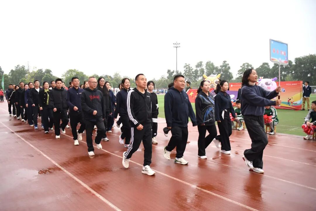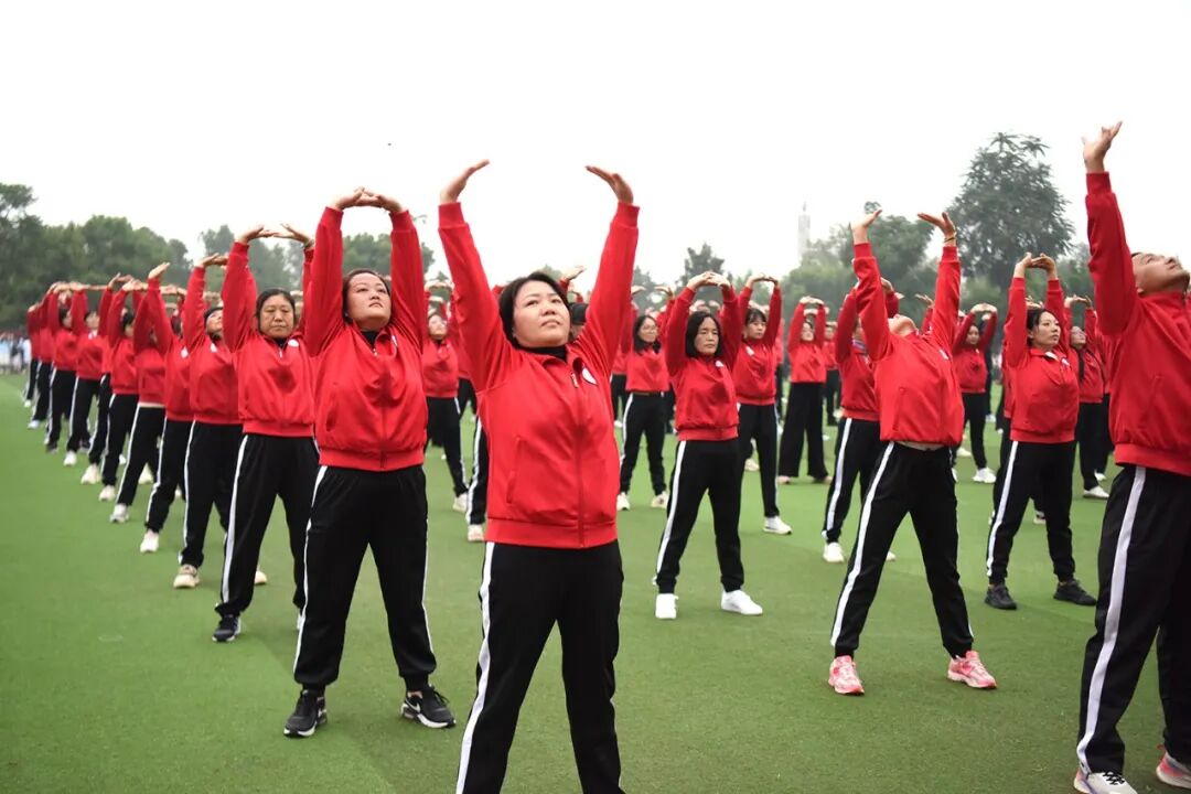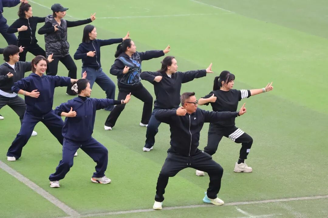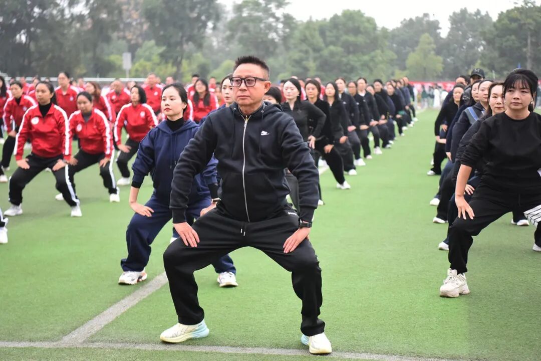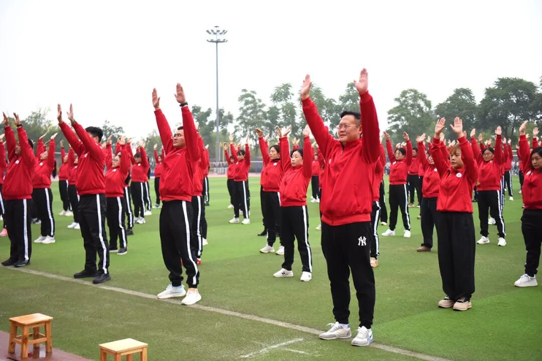 全体教职工与家长代表共同演绎的八段锦,为赛场注入了一份静谧与从容。“松紧结合、动静相宜,神形兼备、气贯全身”,这项传承八百年的传统养生功法,不仅展现了“修身正心”的生活智慧,更传递了学校“奠基幸福人生”的教育追求——强健的体魄,既来自奔跑跳跃的活力,也来自内心的平和与气息的调和。家校携手的画面,更凸显了“办人民满意的教育”的初心——教育不是学校的独角戏,而是家校同心、共育未来的协奏曲。