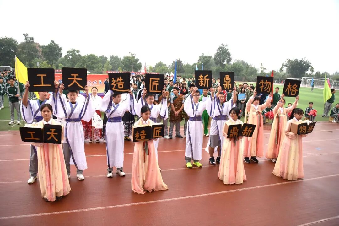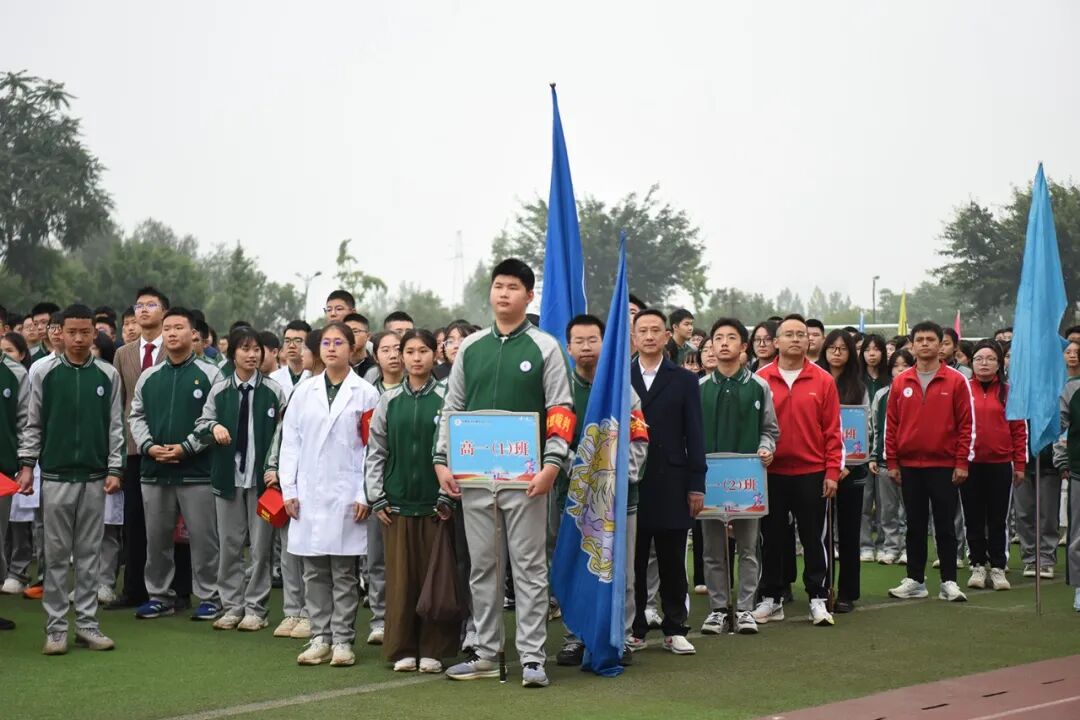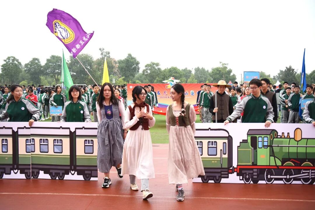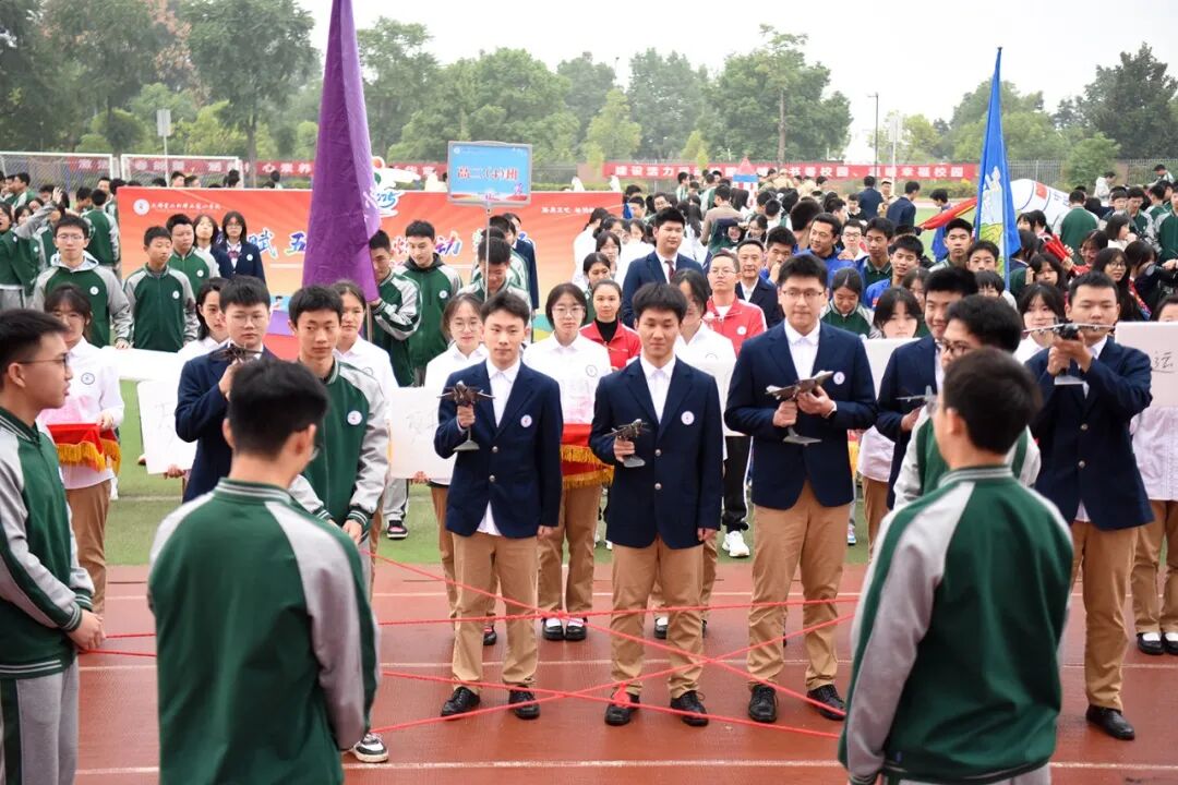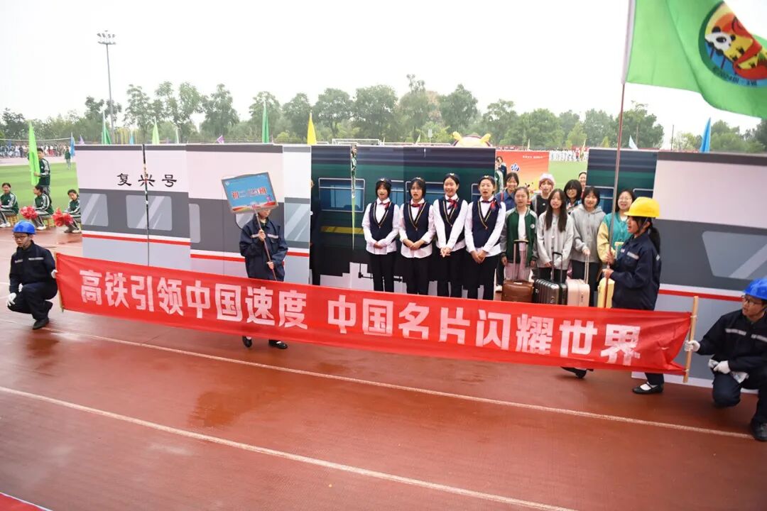 高二学子:他们以“沉稳与奋进”为关键词,展现“核心素养”的积累。高二(1)班“星辰节奏”,将“航天探索精神”融入步伐;高二(2)班“豪情飞扬,梦想启航”,在跑道上追逐风的身影;高二(3)班如“雄鹰展翅、骏马奔腾”,挑战自我极限;高二(4)班35颗心“为同一目标汇聚”,彰显团结力量;高二(5)班以“铁路发展”为主题,从内燃机车到动车组,续写“奋进时速”。他们的从容,是“终身发展力”的沉淀——知道为何出发,更懂得如何前行。
