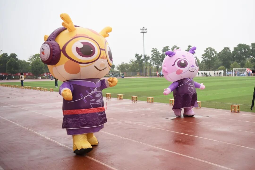 会标与吉祥物方队:会标以圆形基底象征团结,数字“2025”与抽象人形传递运动活力,“智赋五龙”的主题字样彰显教育理念;吉祥物“龙龙”(云纹眉毛、校徽轮廓发型)与“蓉蓉”(中式汉服、俏皮蝴蝶结),生动诠释了“男要‘武’起来,女要‘舞’起来”的培养方向,让“智慧青年”的形象跃然眼前。