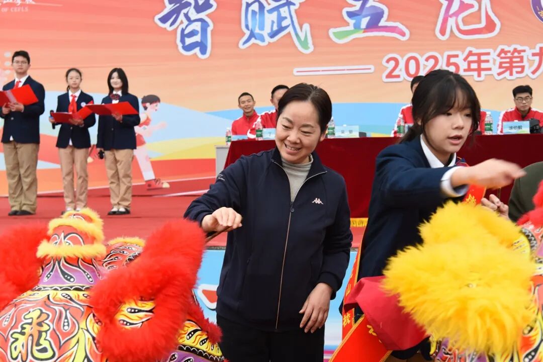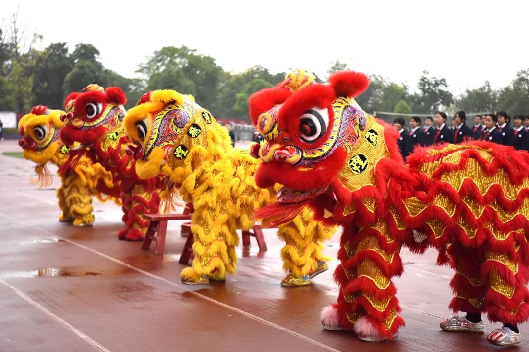 “一点天庭,福星高照;二点眼睛,眼观六路……”涂伯毅老先生、李俊校长、校级家委会会长柏江红女士和张盛副校长等手持朱砂笔,为四头祥狮点睛。醒狮是中华传统文化的象征,“点睛”仪式不仅唤醒了瑞狮的“生命智慧”,更点燃了全体五龙人的斗志——这正是“修身正心”校训的生动演绎,以传统礼仪涵养品德,以祥瑞寓意寄托对学子“成龙成凤”的期许。随后的“吐福”环节,醒狮腾飞的姿态,恰似五龙学子“把懵懂少年培养成智慧青年”的成长轨迹,预示着未来前程似锦。