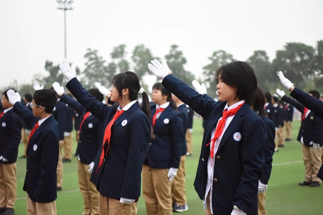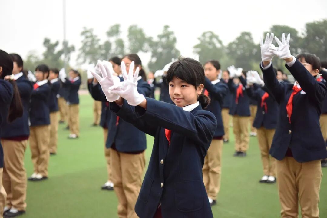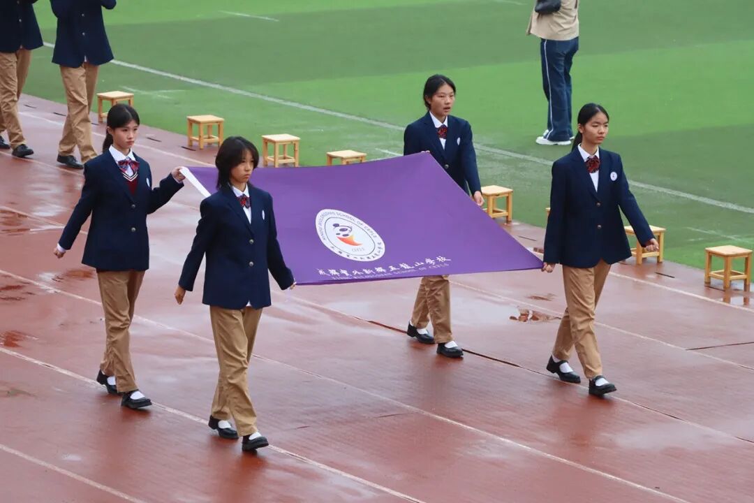 校旗方队:紫色底色的校旗上,繁体校名与英文校名交相辉映,“修身正心、格物致知”的校训融入其中。校旗的每一次飘扬,都在诉说学校“文理兼备、全面发展”的办学特色,指引着学子“从懵懂走向智慧”的成长路。