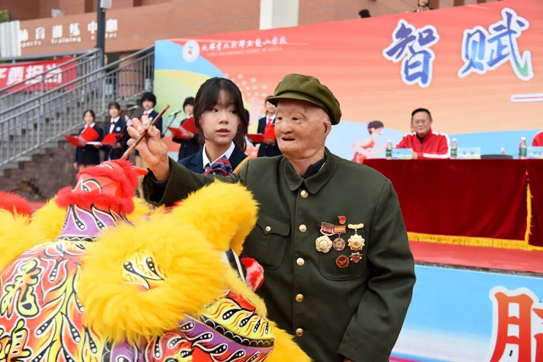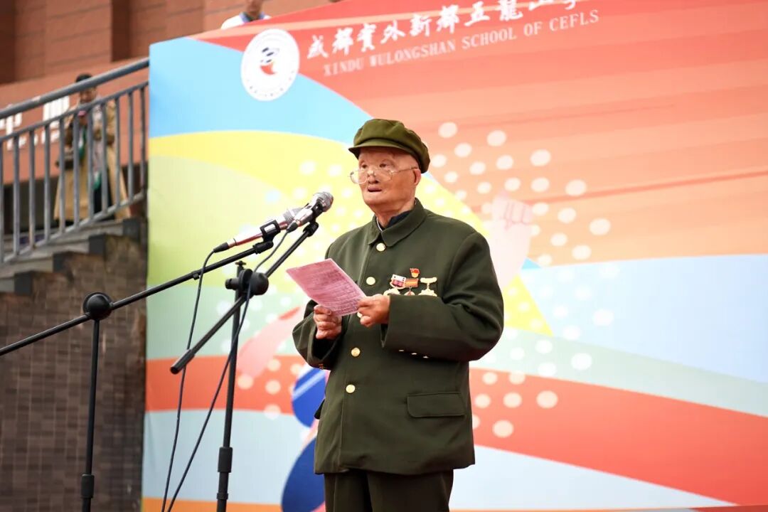 在成都实外新都五龙山学校第九届综合运动会开幕式上,被誉为“活着的邱少云”的抗美援朝老战士、我校少先队校外辅导员涂伯毅同志满怀激动地发表讲话。他首先表达了参与运动会的喜悦,强调党和国家重视体育,指出身体健康是生活、学习、工作及成就事业的根本本钱。他引用习近平总书记“青年兴则国家兴,青年强则国家强”的论述,说明青年关系国家建设与民族复兴,希望同学们奋发图强、努力学习,按要求实现德智体美劳全面发展,创造优异成绩迎接挑战。同时,他祝愿同学们在此次运动会中取得好成绩,鼓励大家加强体育锻炼、增强体质,凭借健康体魄实现远大理想,为党和国家人民作贡献,还号召师生爱党信党跟党走,与全国人民一道在党的领导下建设好中国特色社会主义,让人民更幸福、祖国更强大。