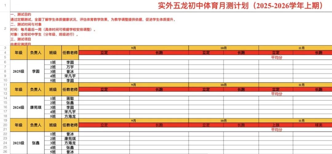 初中年级在学校实行《实外五龙初中体育月测计划》,旨在通过定期测试,全面了解学生体质健康状况,评估体育教学效果,为教学调整提供依据,促进学生体质提升。
