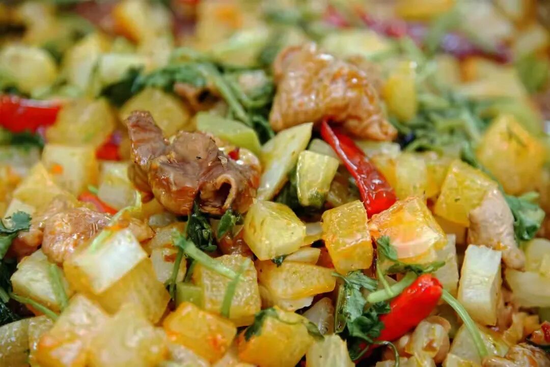 酸辣蹄花、酥肉花菜、桂花肉丝、清炒菜苔、酸菜粉丝汤、小米米饭、水果
