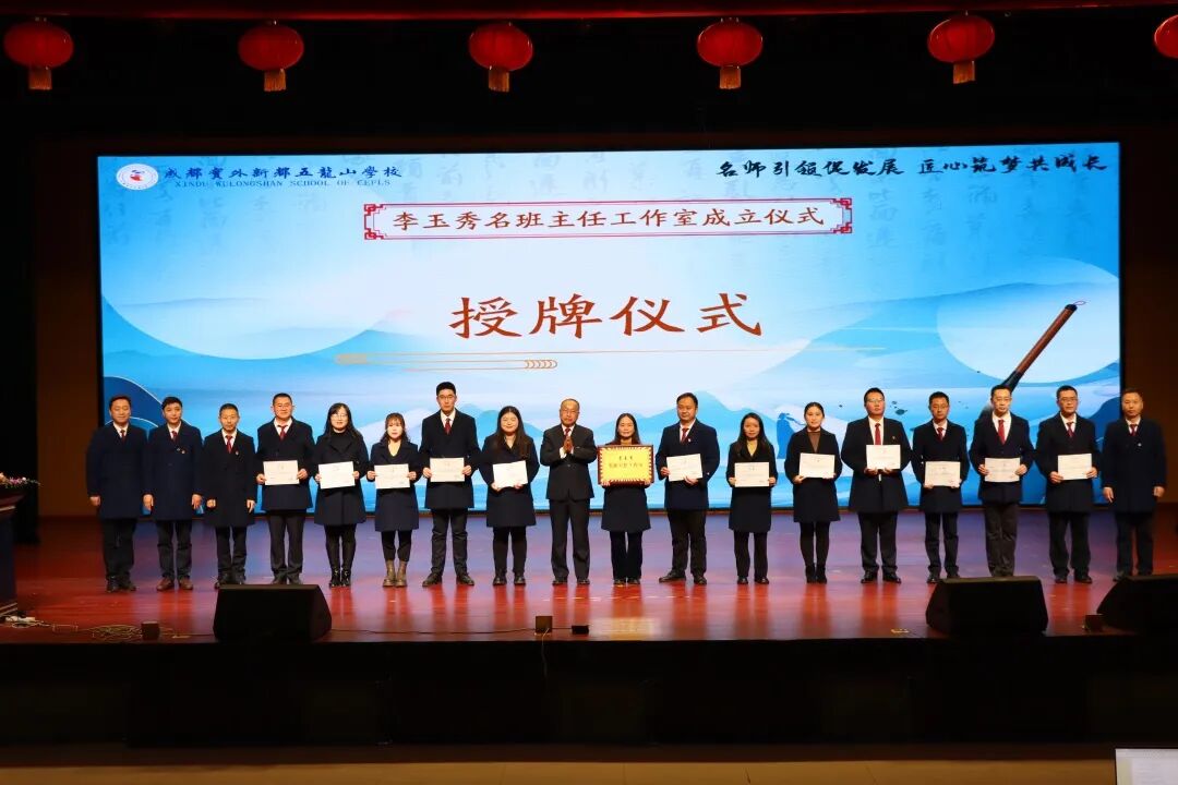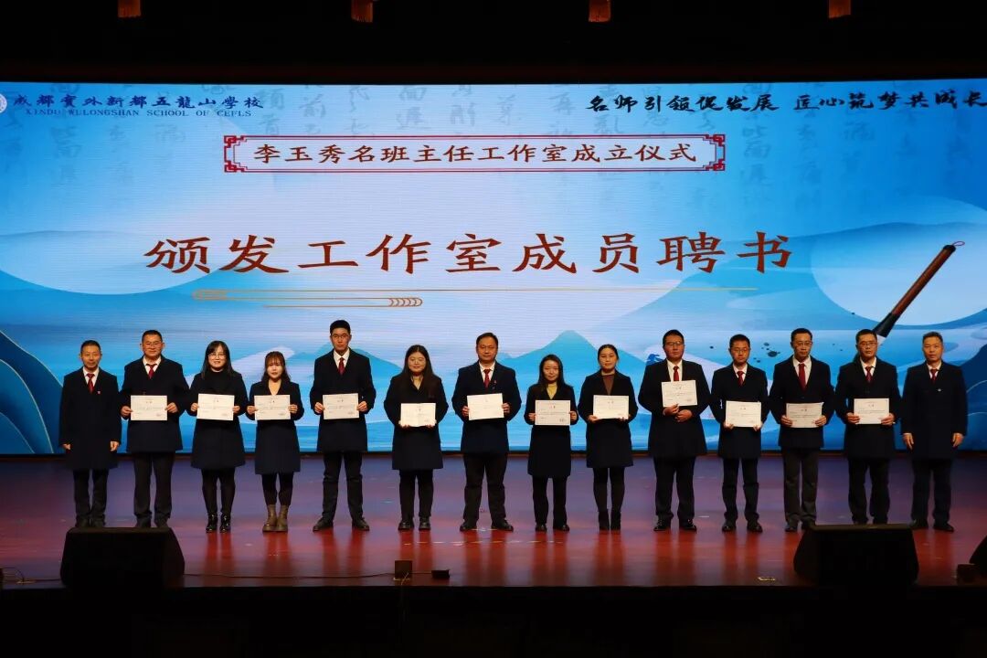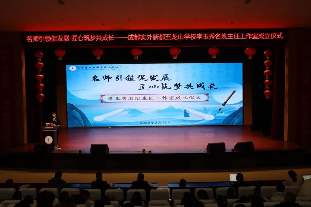教育之本,立德铸魂。成都实外新都五龙山学校牢固树立“立德树人,办人民满意的教育”的办学宗旨,秉持“五育并举,德育为先”的指导思想。学校始终把德育工作放在一切工作的首位,学校德育工作秉持坚定的价值追求,将学生思想品德和人格素养的培养、以班主任为主体的德育队伍建设贯穿于教育实践的各个方面。经过学校长期考察和酝酿,为充分发挥名班主任在德育研究、班级管理、青年教师培养等方面的示范引领作用,打造“以研促教、以教促学、辐射共享”的班主任成长平台,推动学校德育工作专业化、系统化发展,成都实外新都五龙山学校决定成立“‌李玉秀名班主任工作室”。2025年3月11日下午,“李玉秀名班主任工作室”成立大会在学校音乐厅隆重举行,学校党总支书记、校长李俊,副校长张盛、代东风,校长助理周密、林成臣出席会议,全体教职员工参加成立大会,校长助理林成臣主持会议。